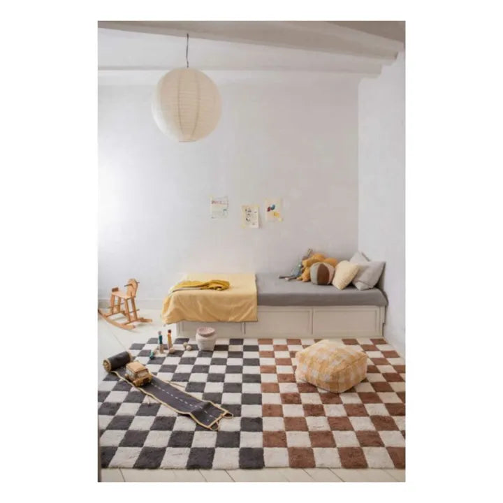- Inspired by vintage ceramic floors, the Kitchen Tiles rug features a checkered pattern playing with a soft contrast of natural and blue sage colors. The rug used our RugCycled mix / Natural canvas base, leaving the base slightly visible in between the colored squares simulating the kitchen tiles.