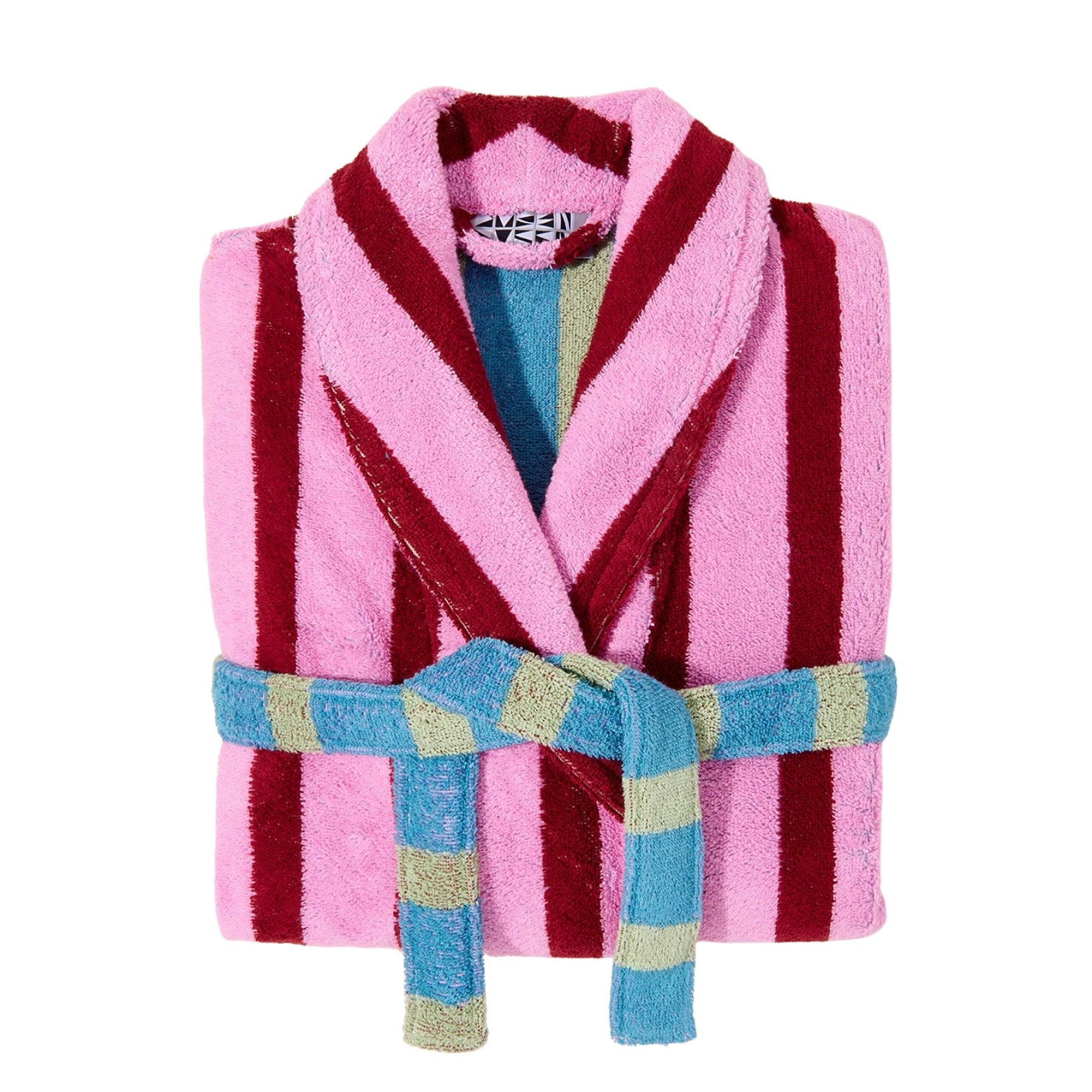 Magnolia Stripe cotton terry bathrobe with shawl collar, patch pockets, and contrast tie. Brushed cotton terry with contrasting stripe colorways on either side. Oeko-Tex Standard 100 certified (no harmful chemicals were used during its production).