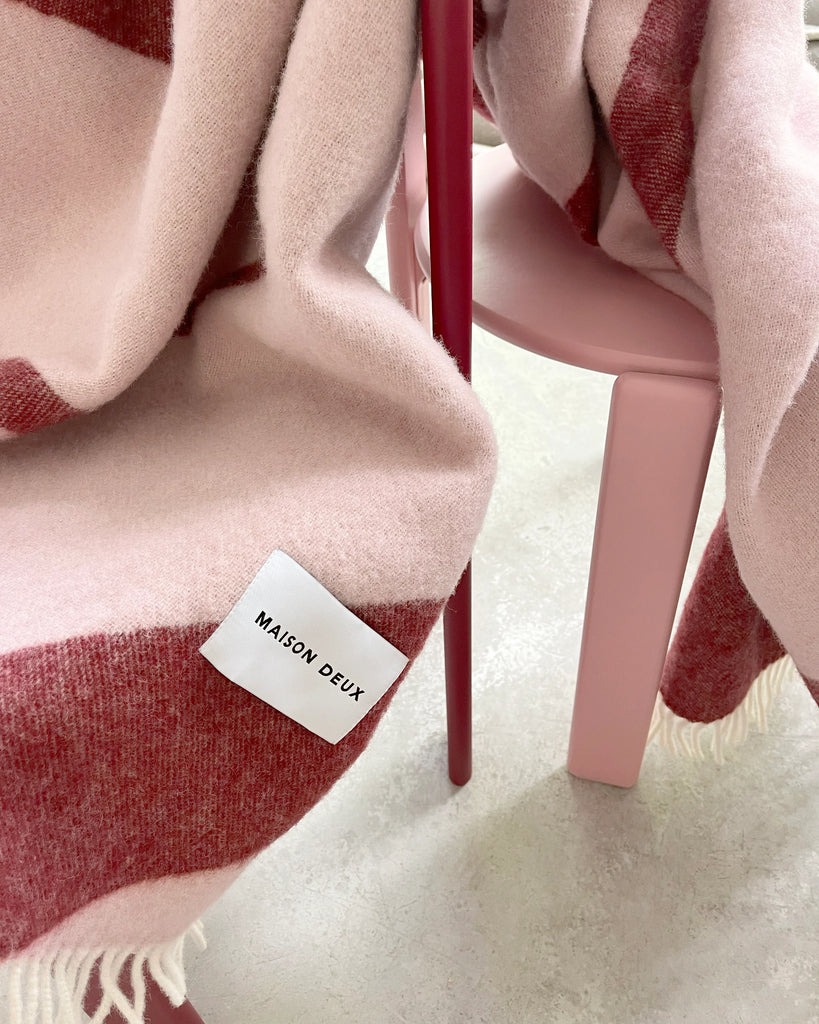 The Swirl Rose Bordeaux throw is woven in Lithuania and certified with the Woolmark and OEKO-TEX labels. Wool is 100% biodegradable and therefore does not contribute to microplastic pollution in our oceans or on our land. Wool is a renewable material: it is 100% natural, 100% renewable and 100% biodegradable.