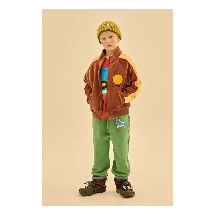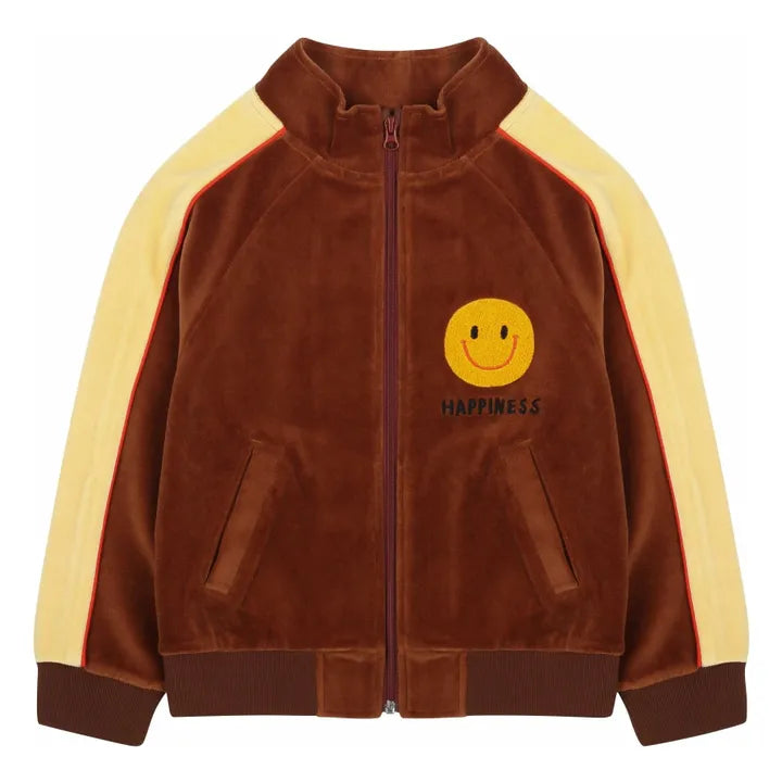 Jellymallow, which gets its name from a combination of "jelly" and "marshmallow", designs pieces that capture the innocence and wonder of childhood. The Happiness sweatshirt is made from cotton-blend velour, featuring zip-up closure and an appliqué smiley face on the front.
