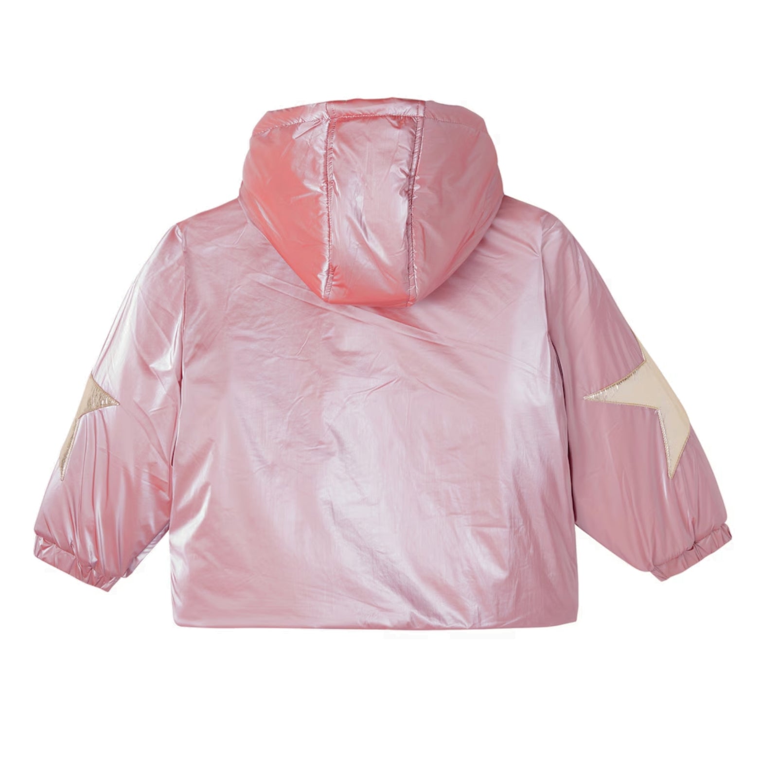 The Shining Star jacket from Jellymallow is named for its bold appliqué patches and lustrous fabric. This design features a padded construction and snug hood to keep them warm and comfortable all day.