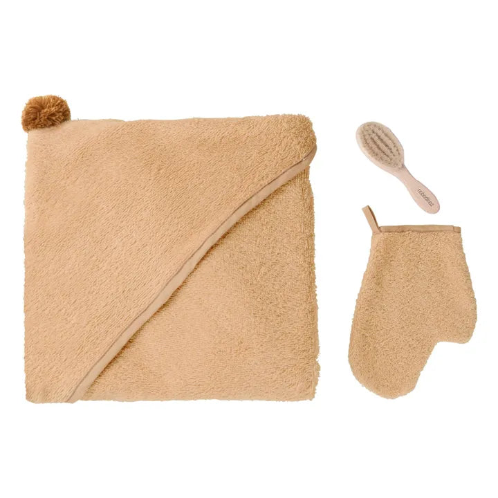 • Give yourself or someone else the perfect baby gift with our extra-soft organic cotton terry bath set. A complete set featuring three essential items from the So Cute line: the bath cape, the washcloth and the ultra-soft natural hairbrush. An essential sensory experience for tenderly pampering baby after bathtime. Presented in an elegant organic cotton envelope, this set includes: - Baby bath cape: 73 x 73 cm - Brush: made from solid beechwood and goat's bristles - origin: Germany - Washing glove - Organic cotton sponge - Ultra-soft fabric - Made locally in Barcelona in a short circuit.