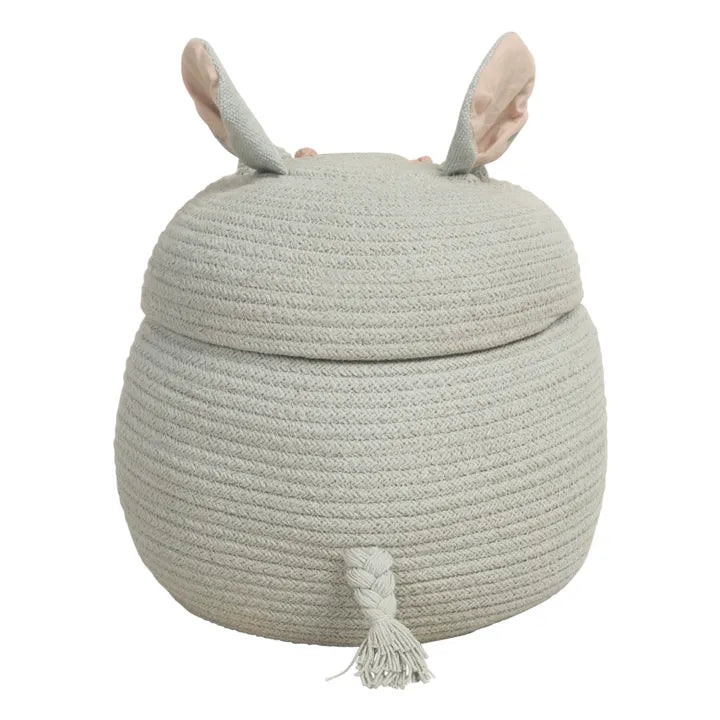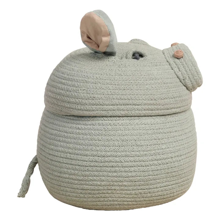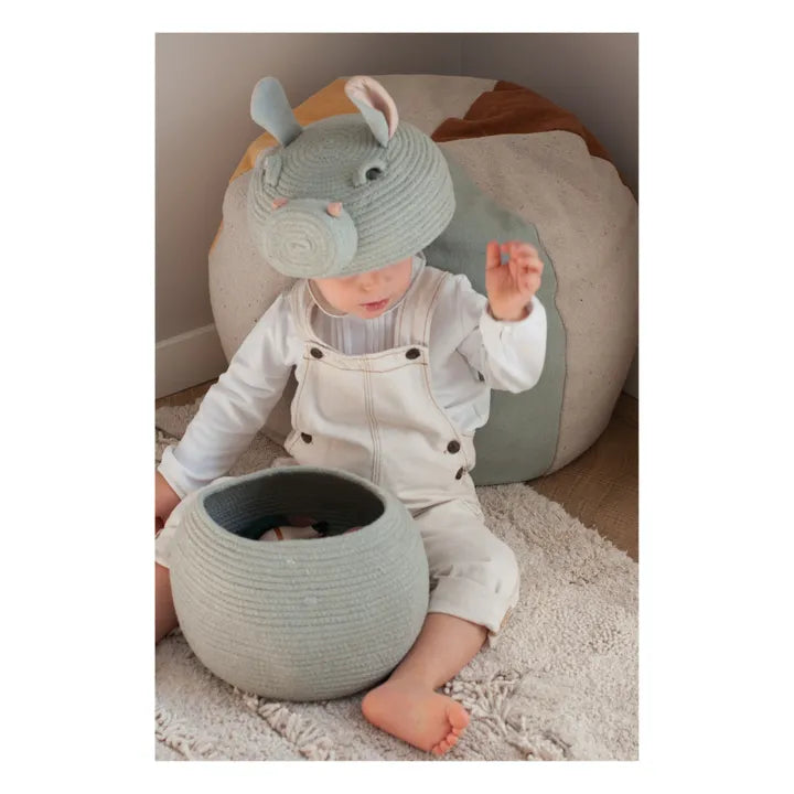 • Carefully Handcrafted using a braided cord made of fibers from recycled PET-bottles covered by our cotton yarns in Blue Sage color, Henry the Hippo basket has a big rounded nose with nostrils in rose color, and folded canvas ears.