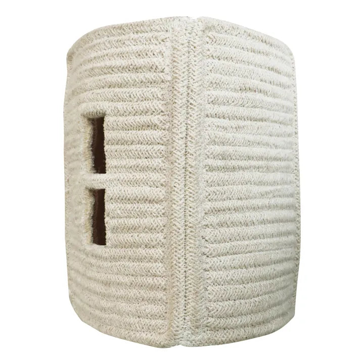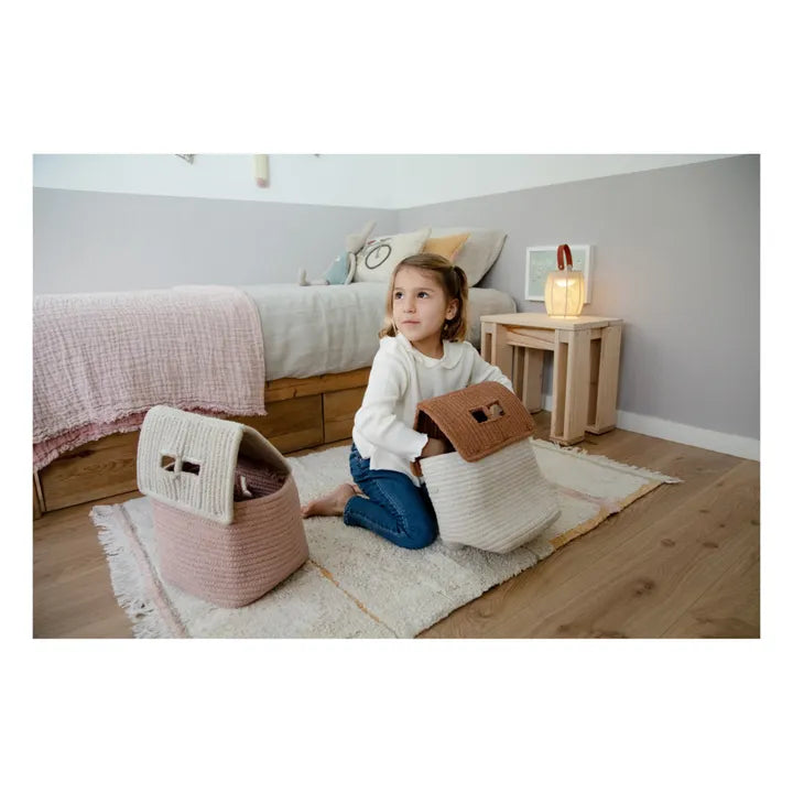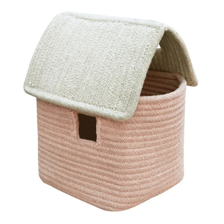 - Decorative basket shaped as a house. Made of extra thick braided cotton cords and handcrafted in a square shape, the basked is crowned with a contrast color gabled roof with cut-out windows. The roof is fixed to the bottom part of the basket, leaving a triangular opening on both sides, which serve as the opening for storage.