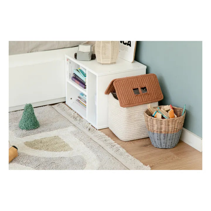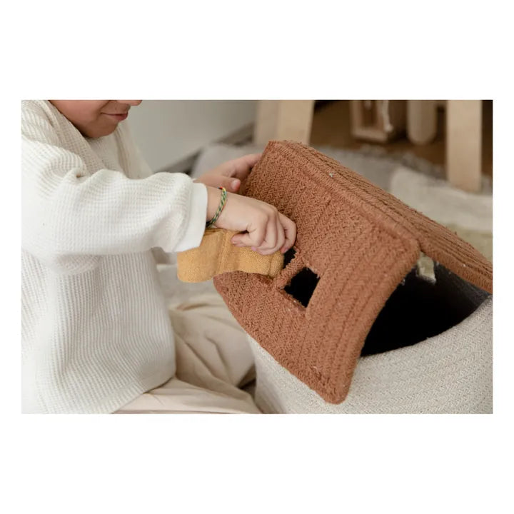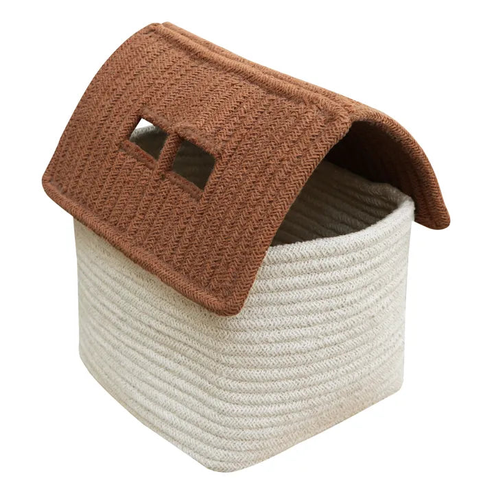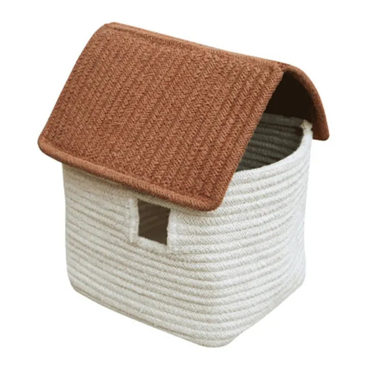 - Decorative basket shaped as a house. Made of extra thick braided cotton cords and handcrafted in a square shape, the basked is crowned with a contrast color gabled roof with cut-out windows. The roof is fixed to the bottom part of the basket, leaving a triangular opening on both sides, which serve as the opening for storage.