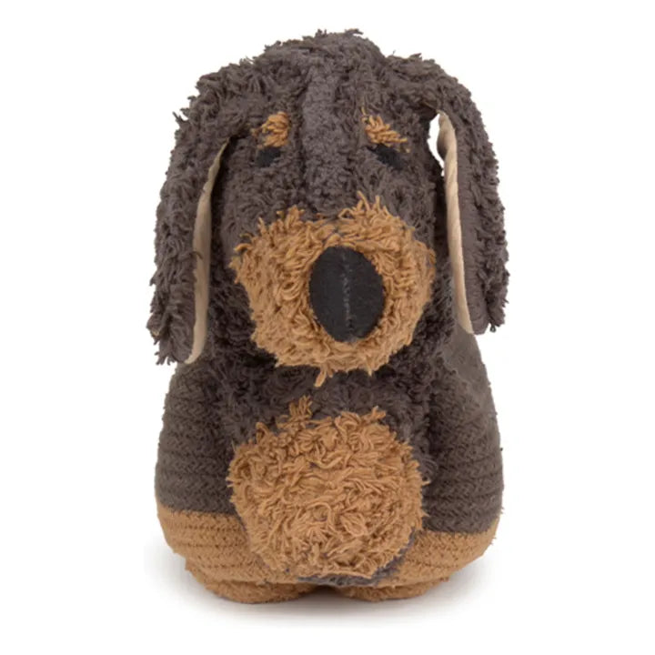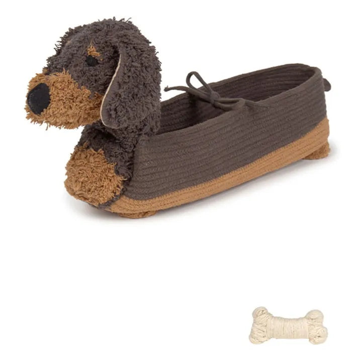 - Meet Sparky! The cuddliest storage companion ever. Shaped like a dachshund, this rectangular basket is handmade from braided cord made from recycled PET bottle fibers, blended with our dark gray cotton. It features a cotton head with embroidered muzzle and hand-knotted eyes, while four pom-poms represent the dog's iconic short legs and tail. It features a cord connecting the sides to hold its shape, and a small plush bone attached to the tag.