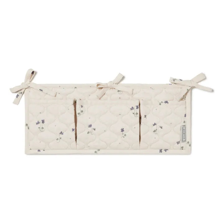 - Quilted bed pocket with three sections made from organic cotton satin. Perfect for hanging on the side of the crib to ensure that smaller necessities such as pacifiers, rattles and bibs are always within reach.