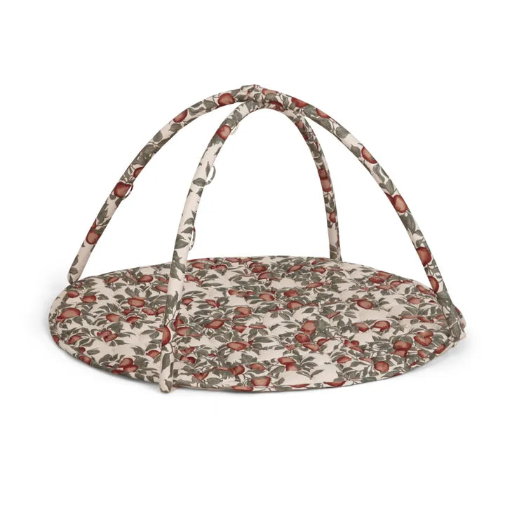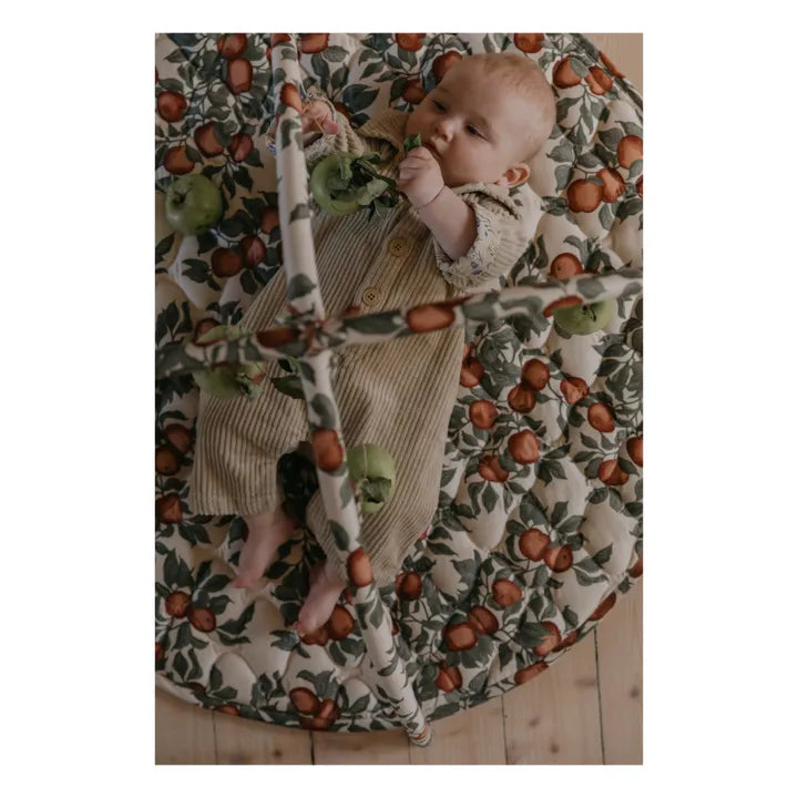 • Quilted activity mat with arches made in durable organic cotton satin. The detachable arches are attach to the blanket with velcro and are designed with loops to hang activity toys made for interactive play. The activity mat can be used without the arches as a playmat when the child can sit up by itself and the padding provides a soft surface for the child to play on.