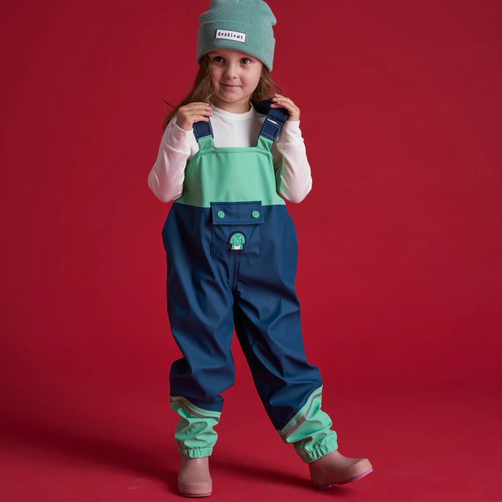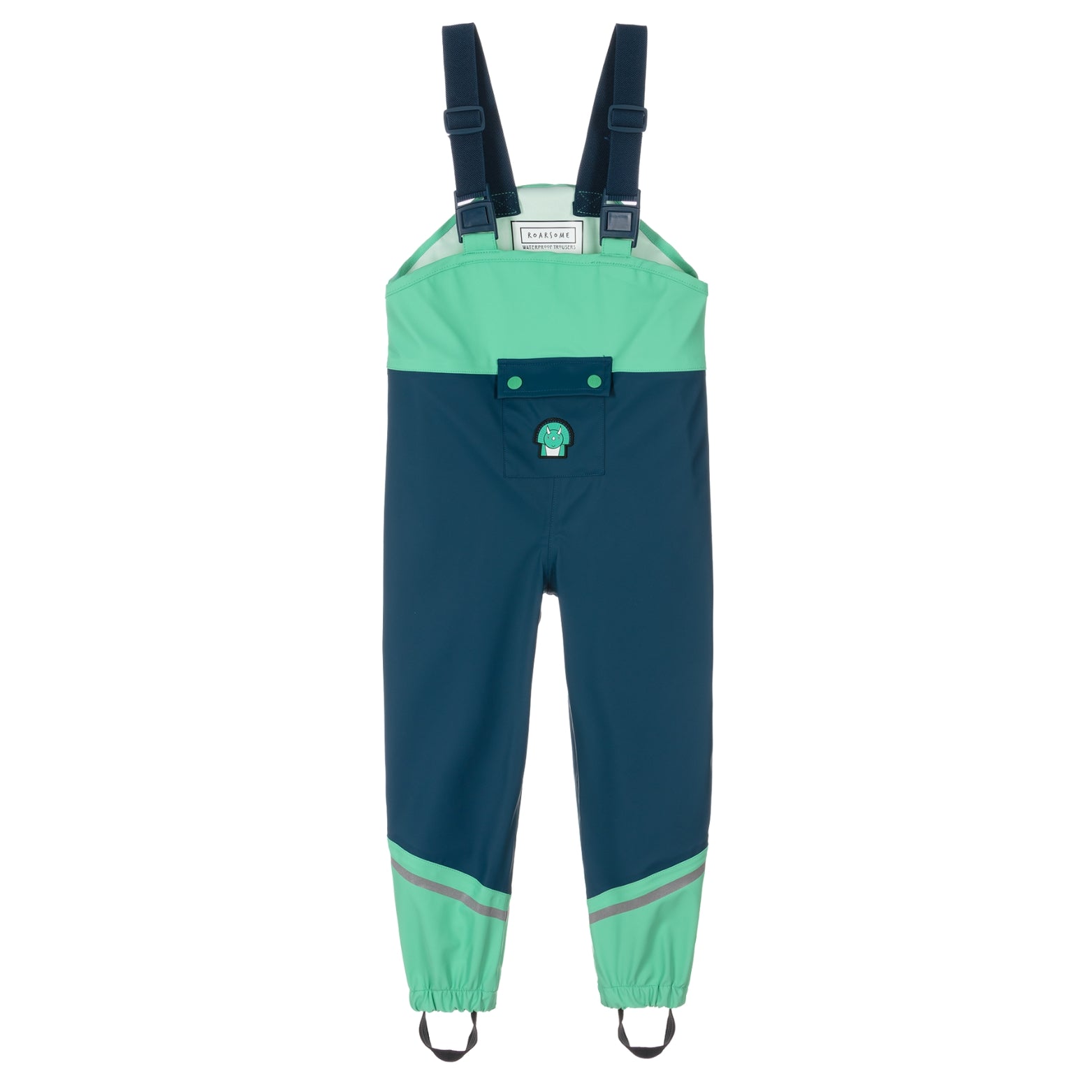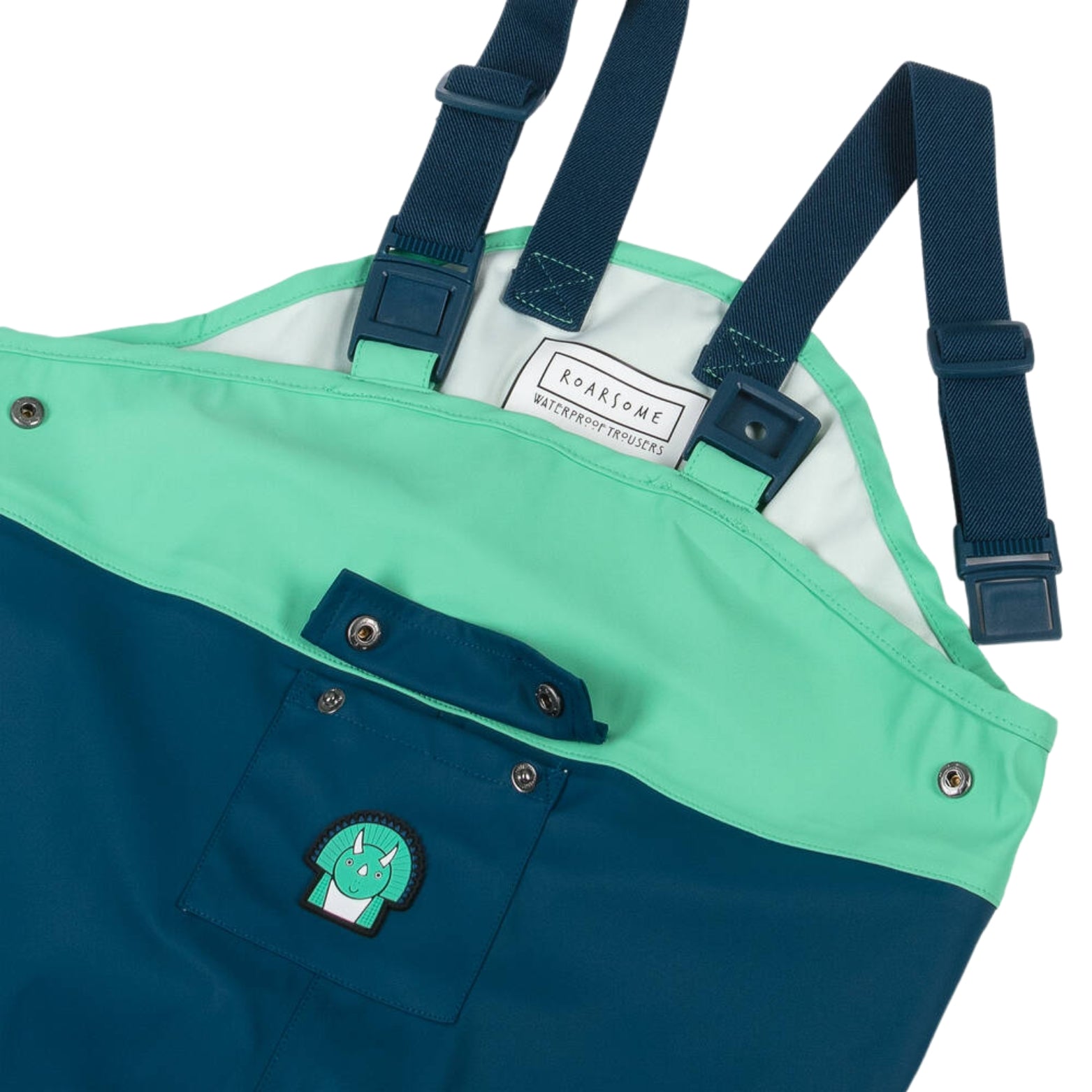 A fun blue rainsuit by outerwear brand Roarsome, made in smooth waterproof fabric. In keeping with it's fun character theme, a rubberised motif on the chest. Designed for comfort and to keep your child dry during wet weather adventures, it features taped seams and aqua seal zips. Great for jumping in puddles, it has removable elasticated foot straps that attach with poppers.