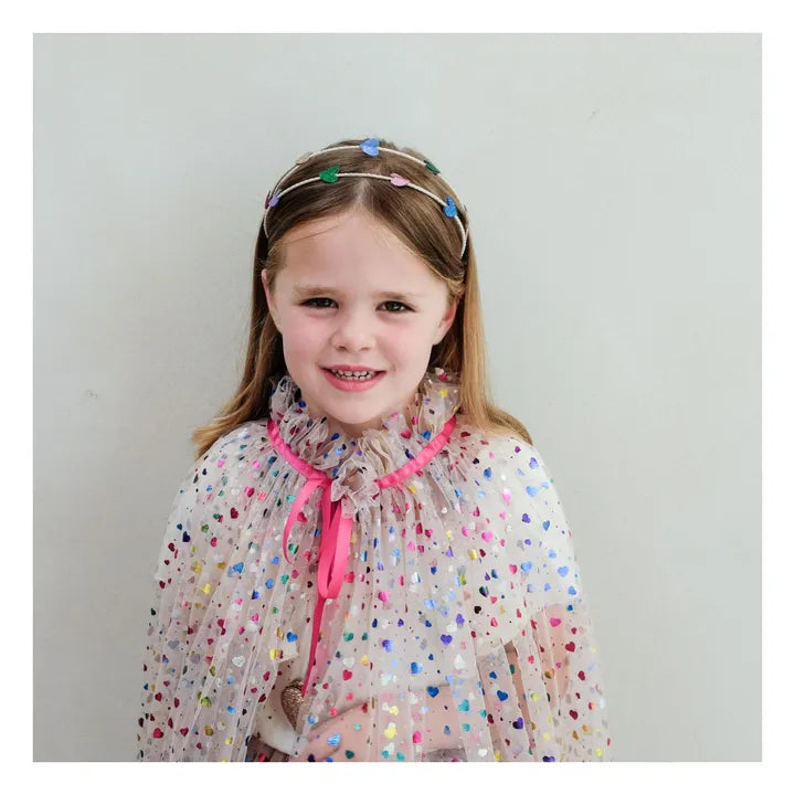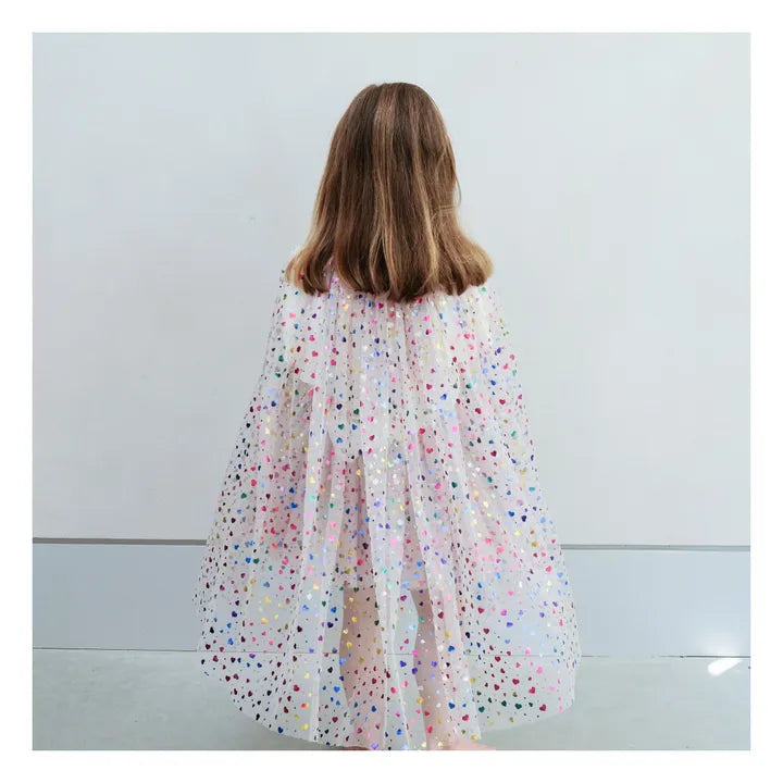 - Twirl into a world of wonder with this beautiful Rainbow hearts cape! Layers of soft tulle scattered with multicoloured hearts sure to catch the light with every spin!