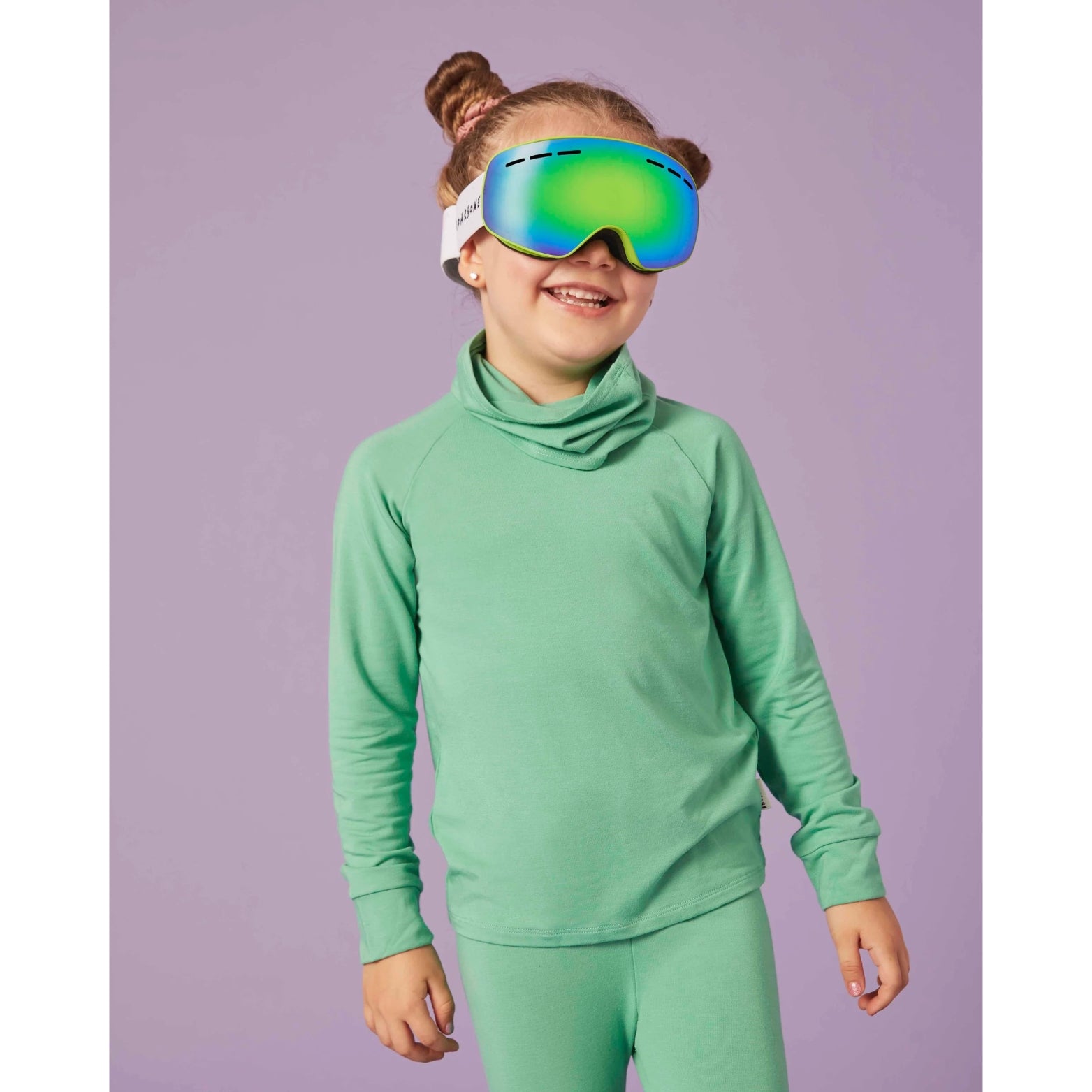 A green base layer set for boys and girls from British label Roarsome. Both items are made in beautifully soft, stretchy and comfortable bamboo jersey with temperature-regulating natural qualities. The top has long raglan sleeves for freer movement. The bottoms are snug-fitting with an elasticated waist to ensure quick and simple dressing.
