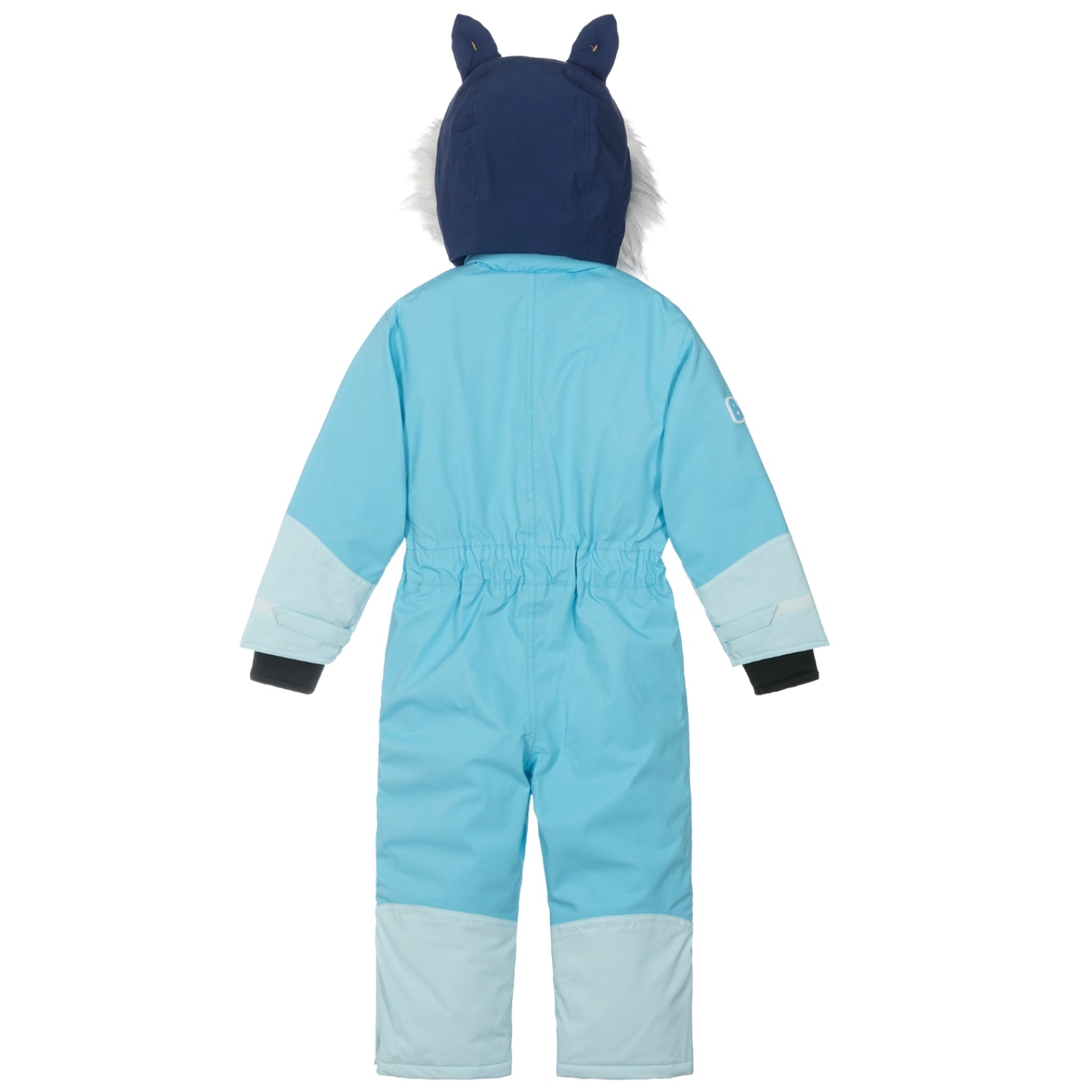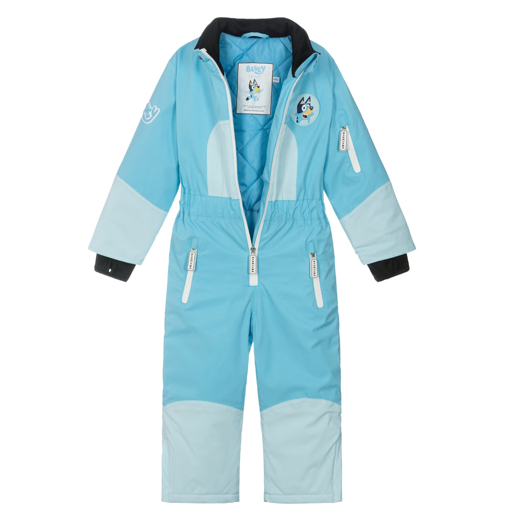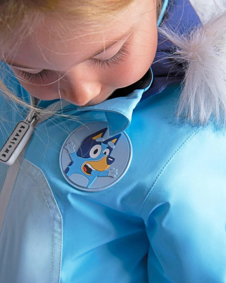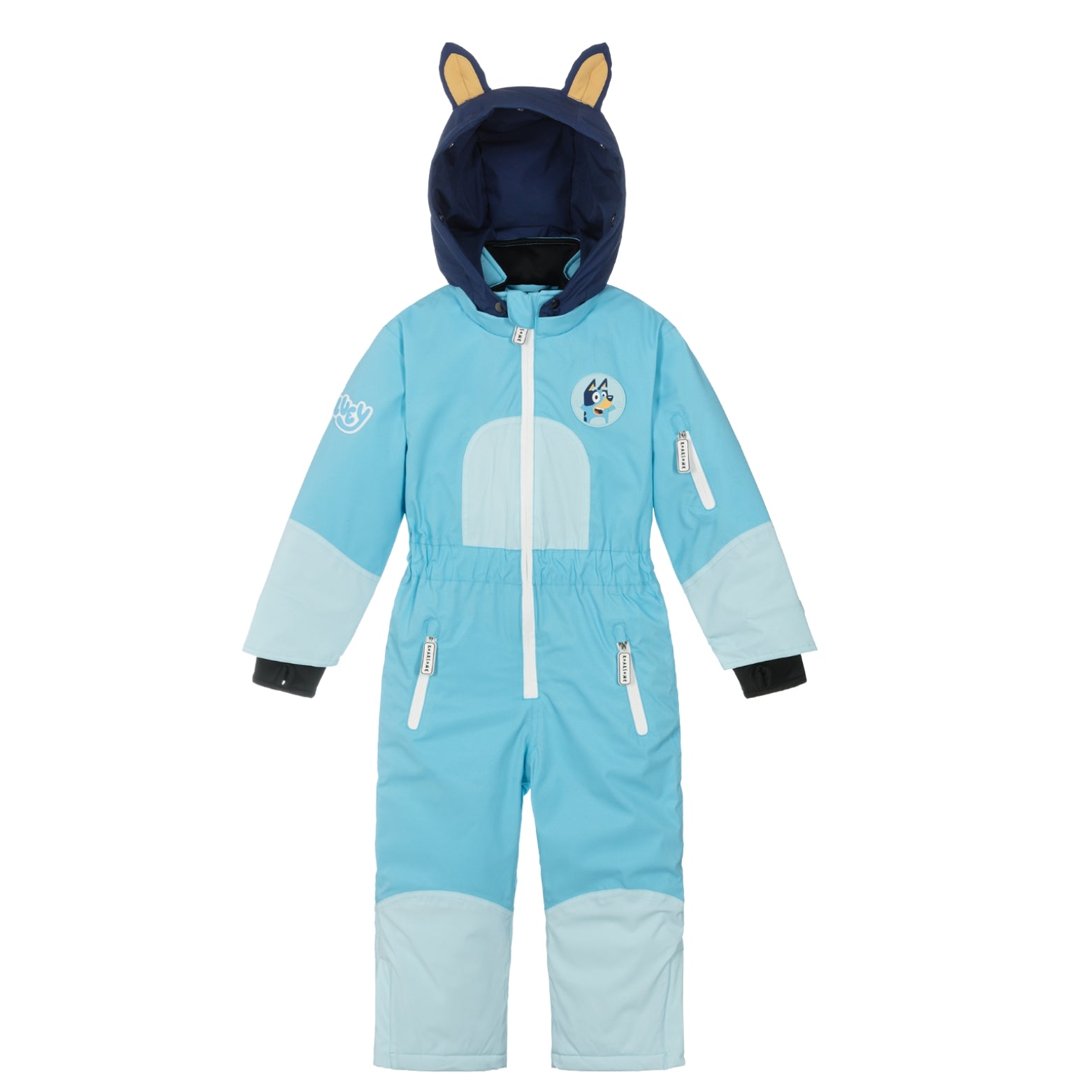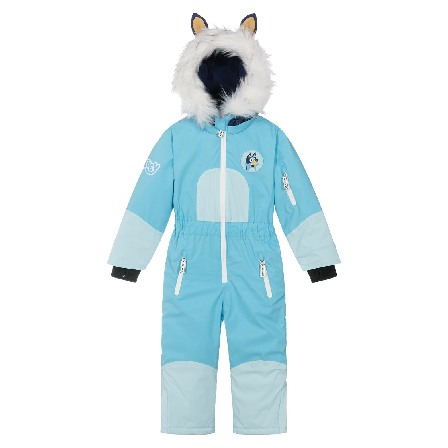 Designed in collaboration with Bluey, this Roarsome snowsuit brings color and fun to the slopes. Crafted from a waterproof fabric, the design features a plush hood with playful ears, a half-zipped front, and rubber motif.