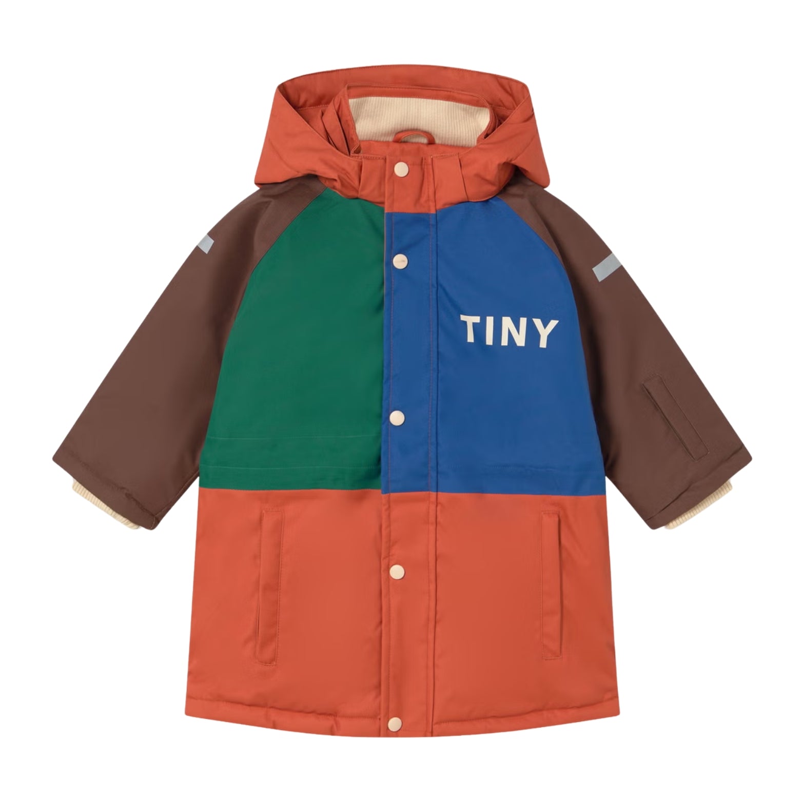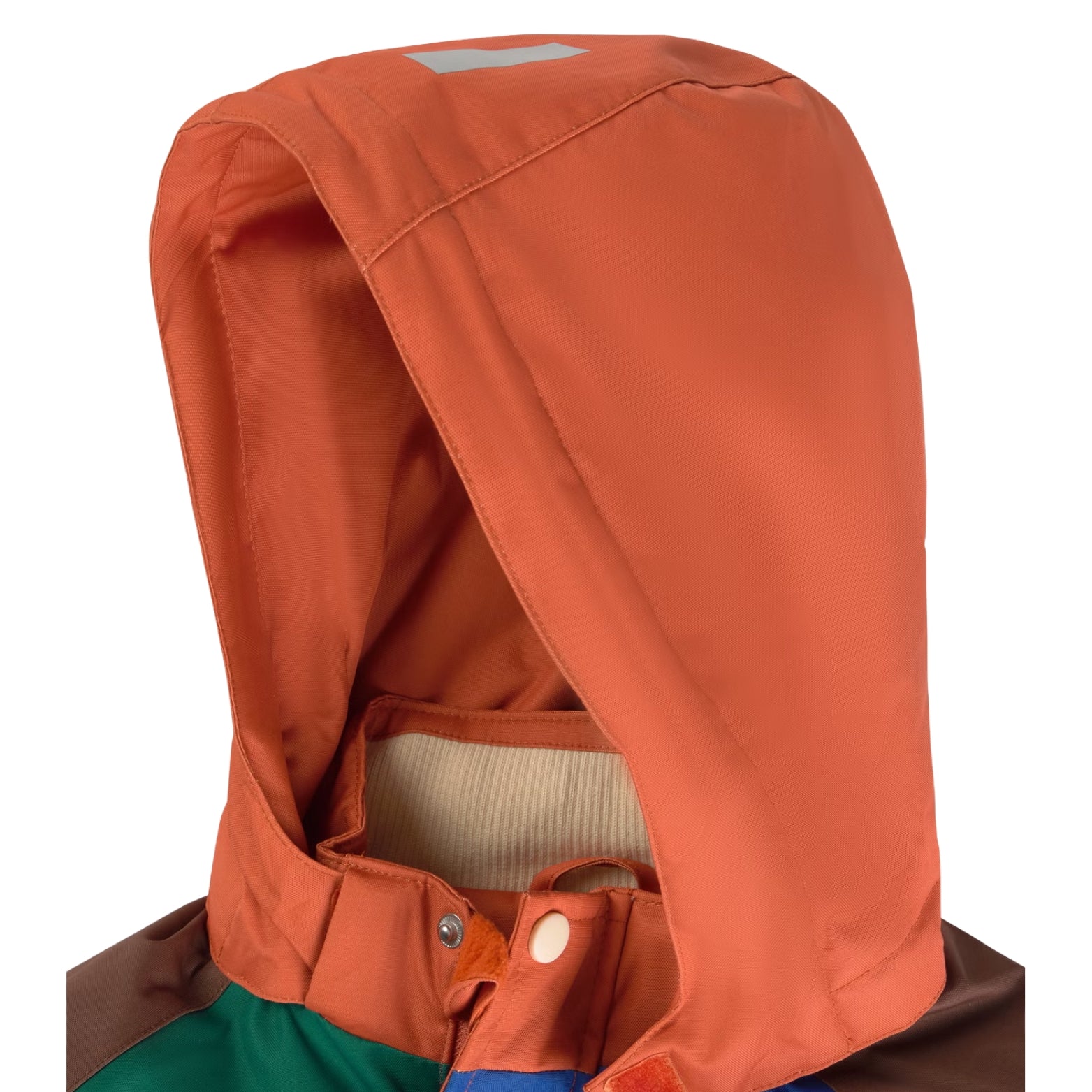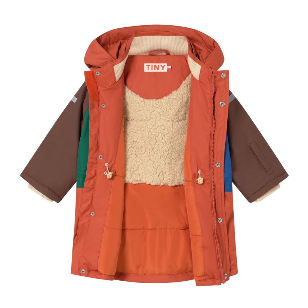 Warm and ready for winter adventures, this color-block snow jacket features a cozy sherpa-lined inner panel and fleece-lined pockets for extra comfort. A snug hood, ribbed cuffs, and a full zip with snap-button placket keep out the cold, while an adjustable inner waist ensures the perfect fit. Reflective strips on the arms and hood add a smart safety detail. Made from wind- and water-resistant fabric, built for all snowy days.