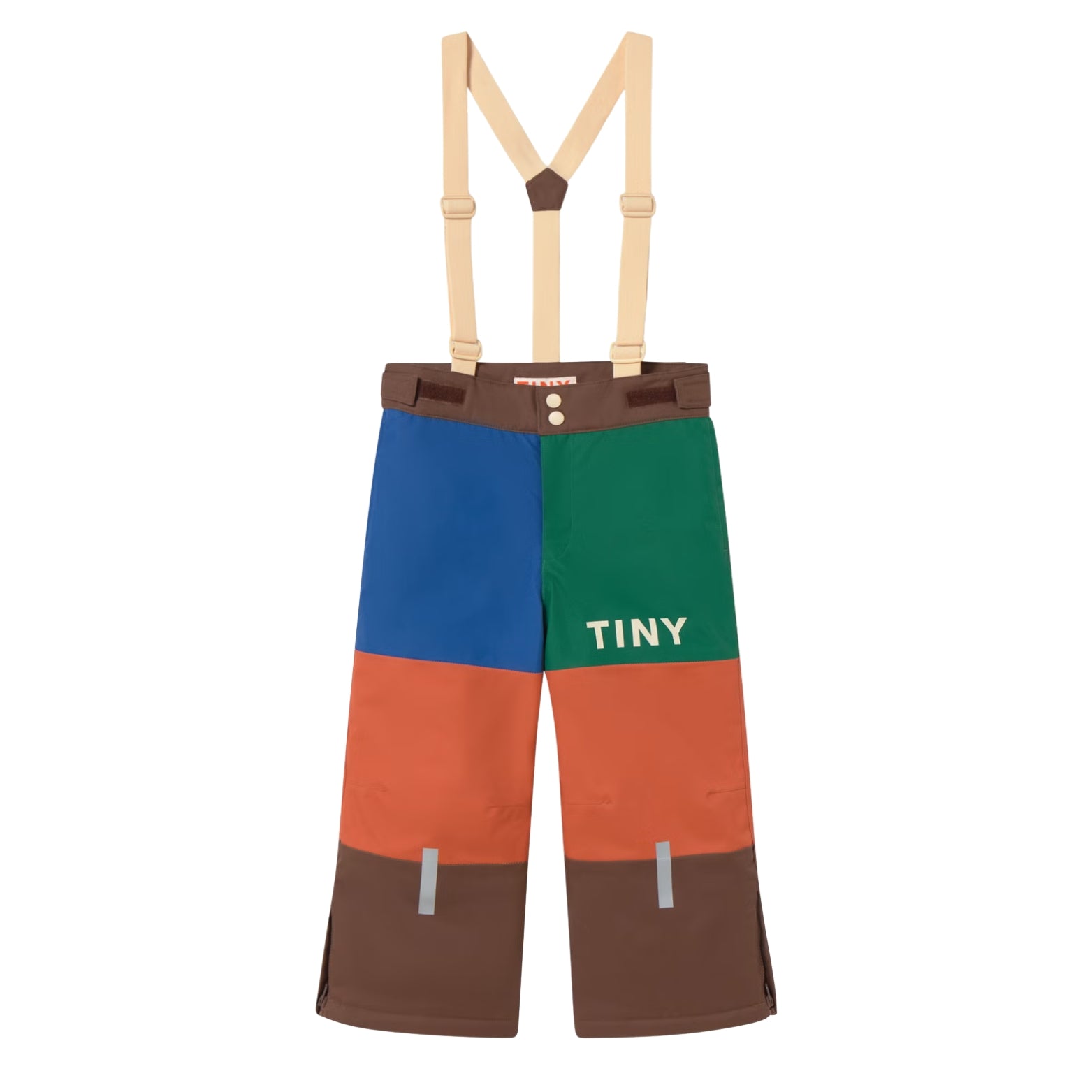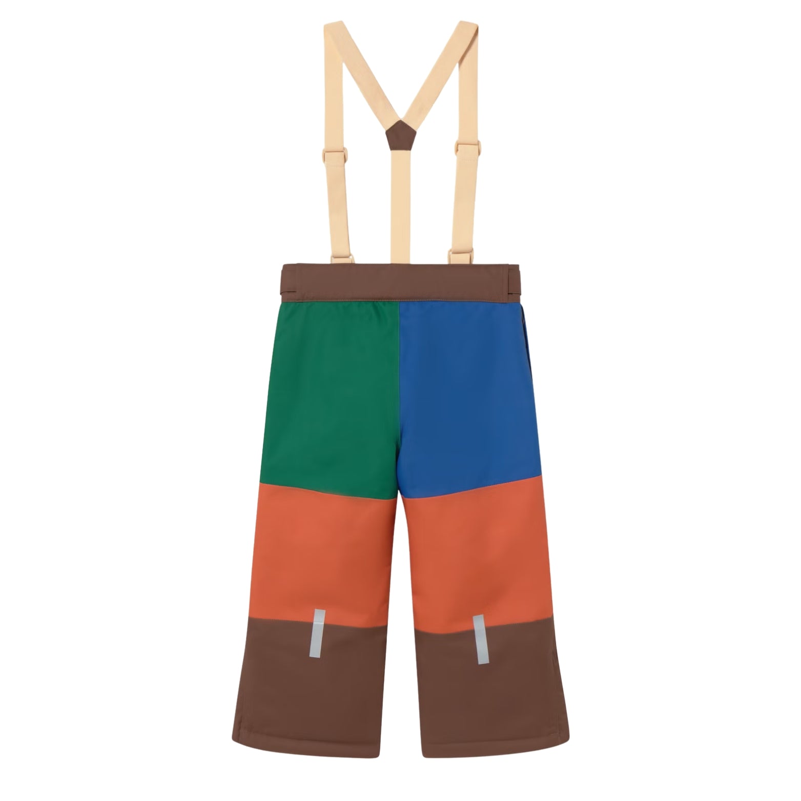 Padded and fully fleece-lined, these color-block snow pants are ready for cold-weather adventures. They feature a zip fly with snap closures, integrated snow gaiters with anti-slip bands, and ankle zips to fit easily over ski boots. The elasticated waist with Velcro tabs ensures a perfect fit, while elastic shoulder straps provide extra support. Reflective strips add an important safety touch. Made from wind- and water-resistant fabric, perfect for every snowy day.