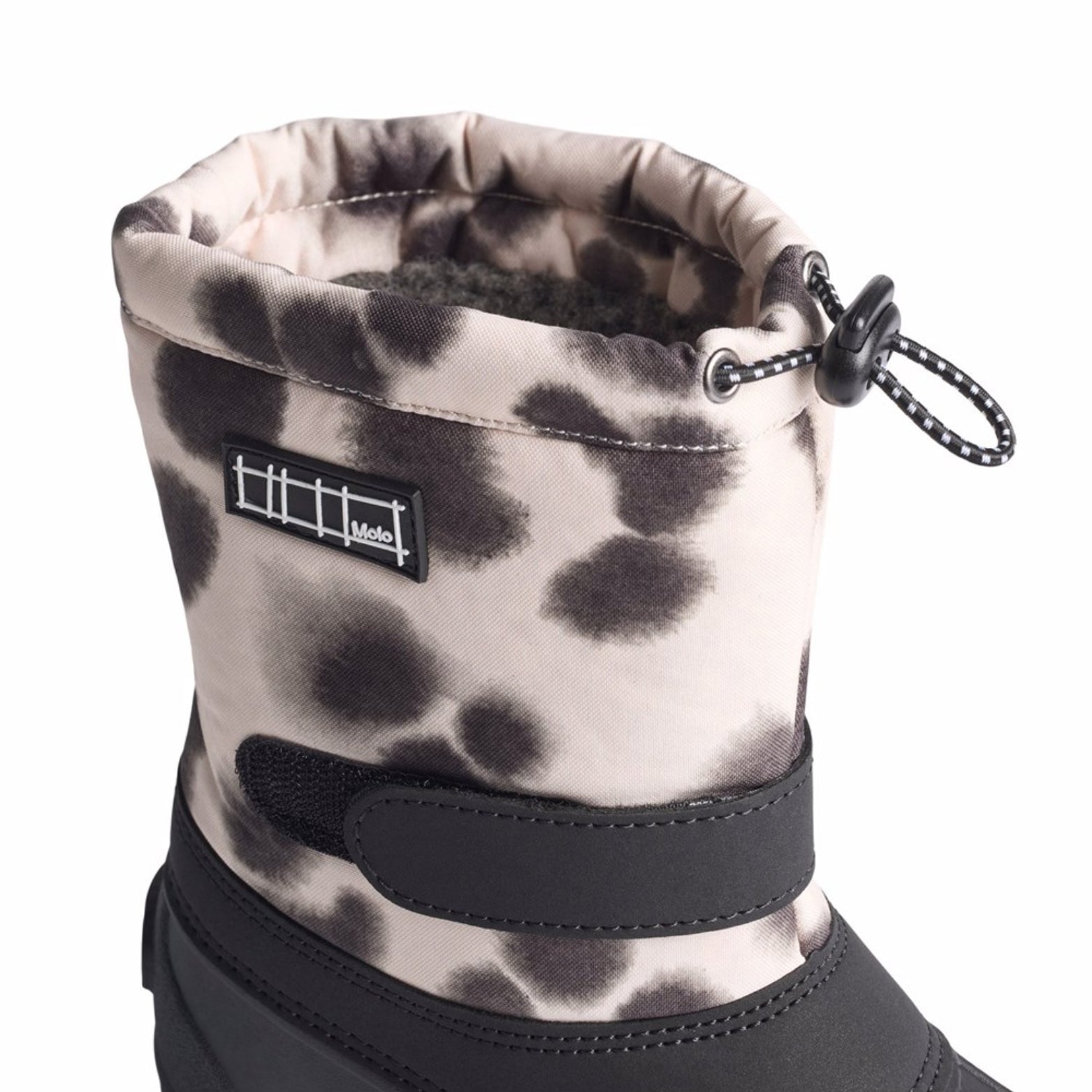 Practical winter boots with a snow leopard-spotted print and a sturdy and non-slip black sole. The boots have an adjustable elastic at the top of the shaft, adjustable velcro around the ankle, an inner sock, and a good height, making them suitable for all types of weather.
