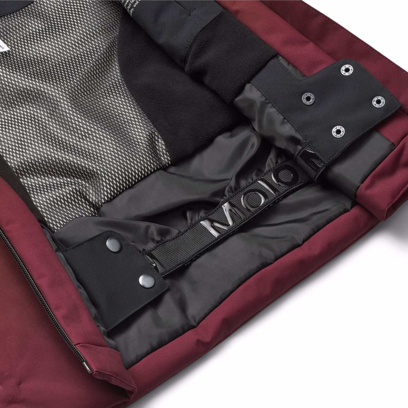 Wind and waterproof red and pink gradient coloured winter jacket made of recycled polyester. The jacket has a lined hood, a front zipper with flap, as well as waterproof zipper pockets. There is a pocket on the sleeve for a ski pass and an interior pocket for extra storage. The jacket has a wind flap around the waist, velcro around the wrists, and sleeve openings with thumb holes, which keep the snow, wind, and water out. Furthermore, the jacket is lined with fleece, padded with 3M™ Thinsulate™, and a text reflector to be visibel in traffic.