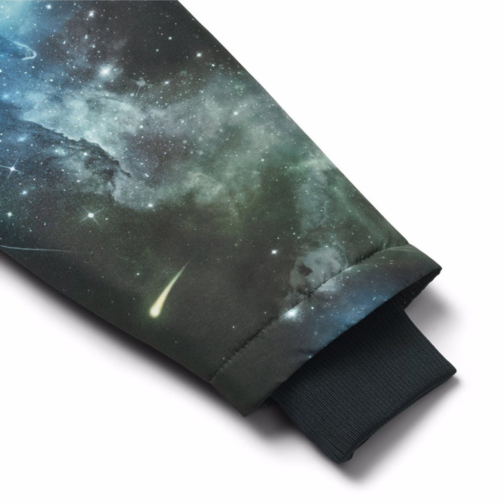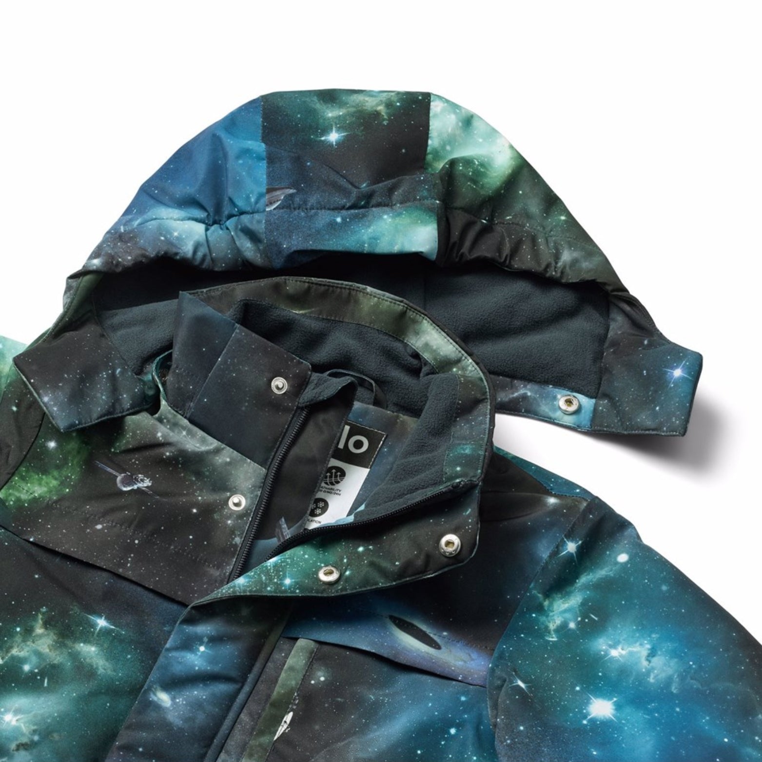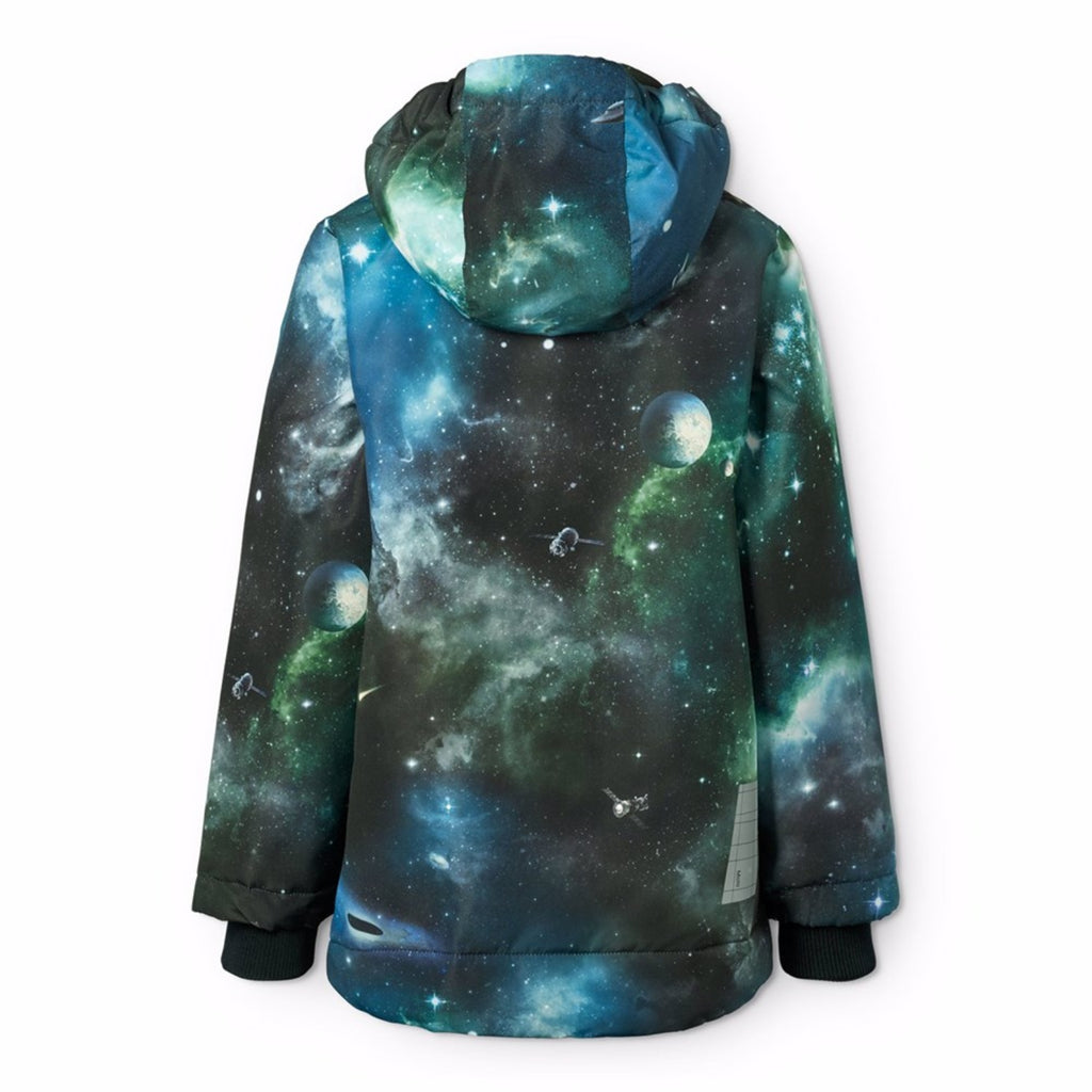 Wind and waterproof jacket with space print in recycled polyester. The jacket has a practical zip closure with flap, high collar, and detachable lined hood. The jacket is designed with front pockets, a chest pocket with zipper, ribbed cuffs at the wrists to effectively help against the wind. On the back, there is a large reflector that increases visibility in traffic. The jacket is lined with soft, recycled polyester filling, which provides a smooth comfort and optimal thermal insulation.