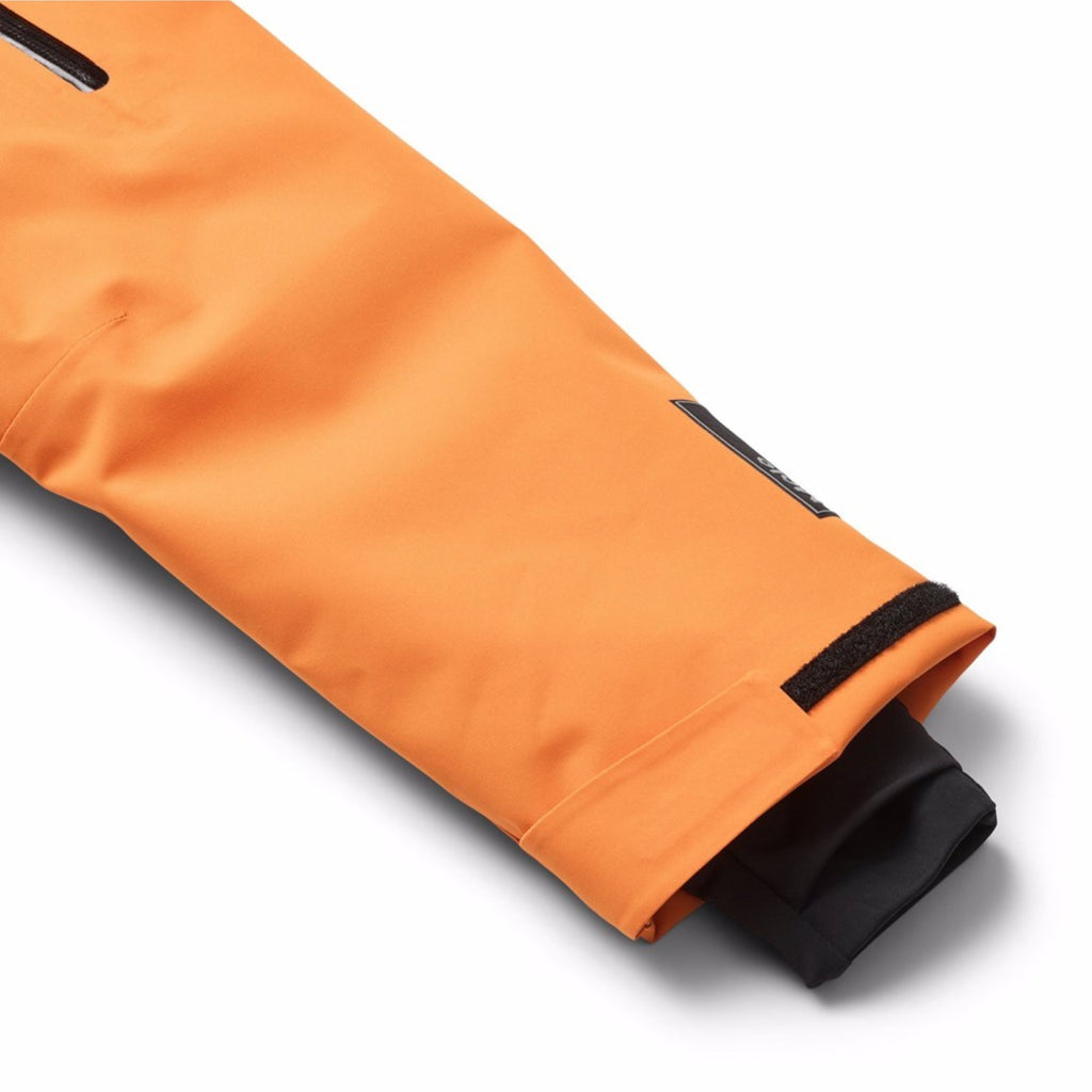 Wind and waterproof orange winter jacket made of recycled polyester. The jacket has a lined hood, waterproof zippers, a pocket on the sleeve for a ski pass and an interior pocket for extra storage. The jacket has a wind flap around the waist, velcro around the wrists, and sleeve openings with thumb holes, which keeps the snow, wind and water out. Additionally, the jacket is lined with fleece, padded with 3M™ Thinsulate™ and it has a reflective text to increse the visibility in traffic.