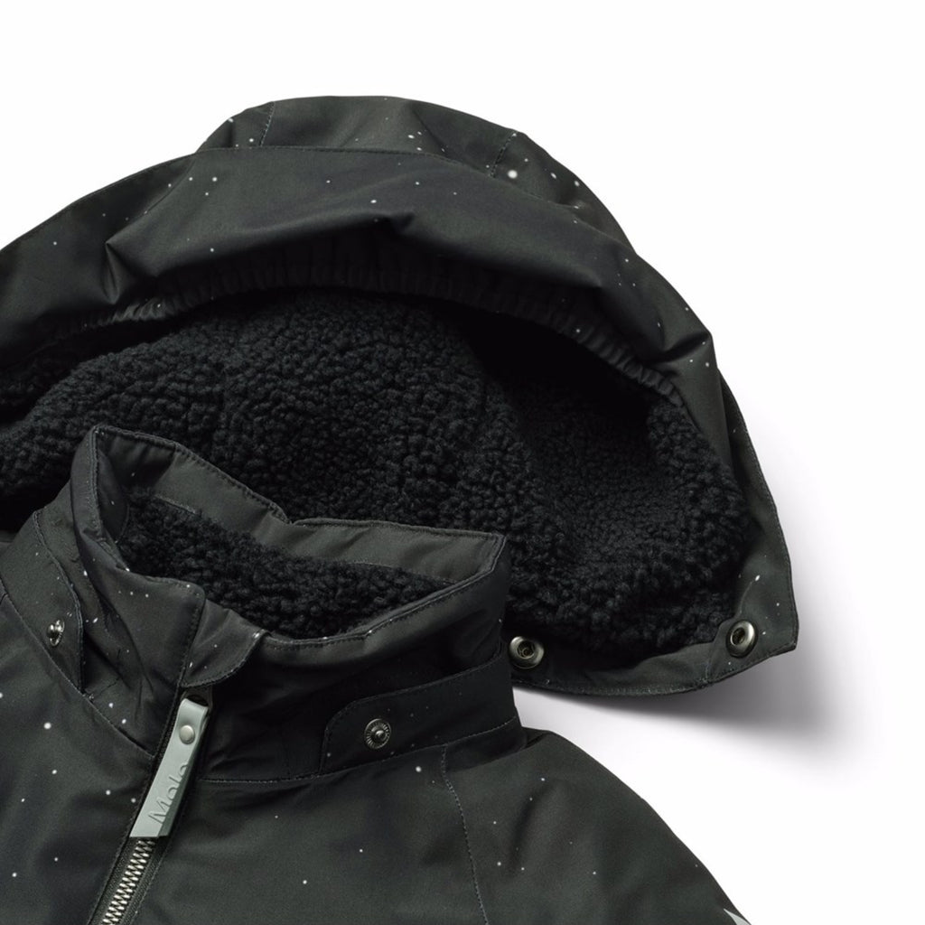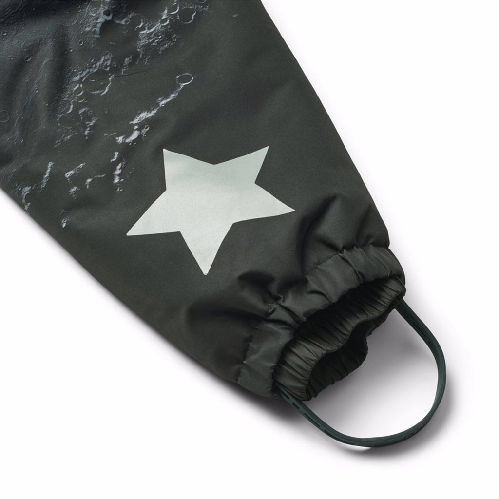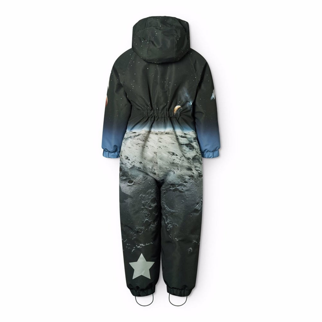 Water-repellent jumpsuit with space print for the little ones, made of recycled polyester. The suit has a detachable, lined hood and an extra long zipper on the front, making it easy to put on and take off. The elastic at the waist and at the sleeve and leg cuffs ensures that snow, rain, and wind are kept out, while mittens and boots stay in place. The jumpsuit is equipped with reflective bands on the pockets and sleeves, ensuring extra visibility in traffic. Additionally, the suit has fleece lining at the seat and back, as well as internal adjustable elastic at the waist, providing a snug and comfortable fit around the body.