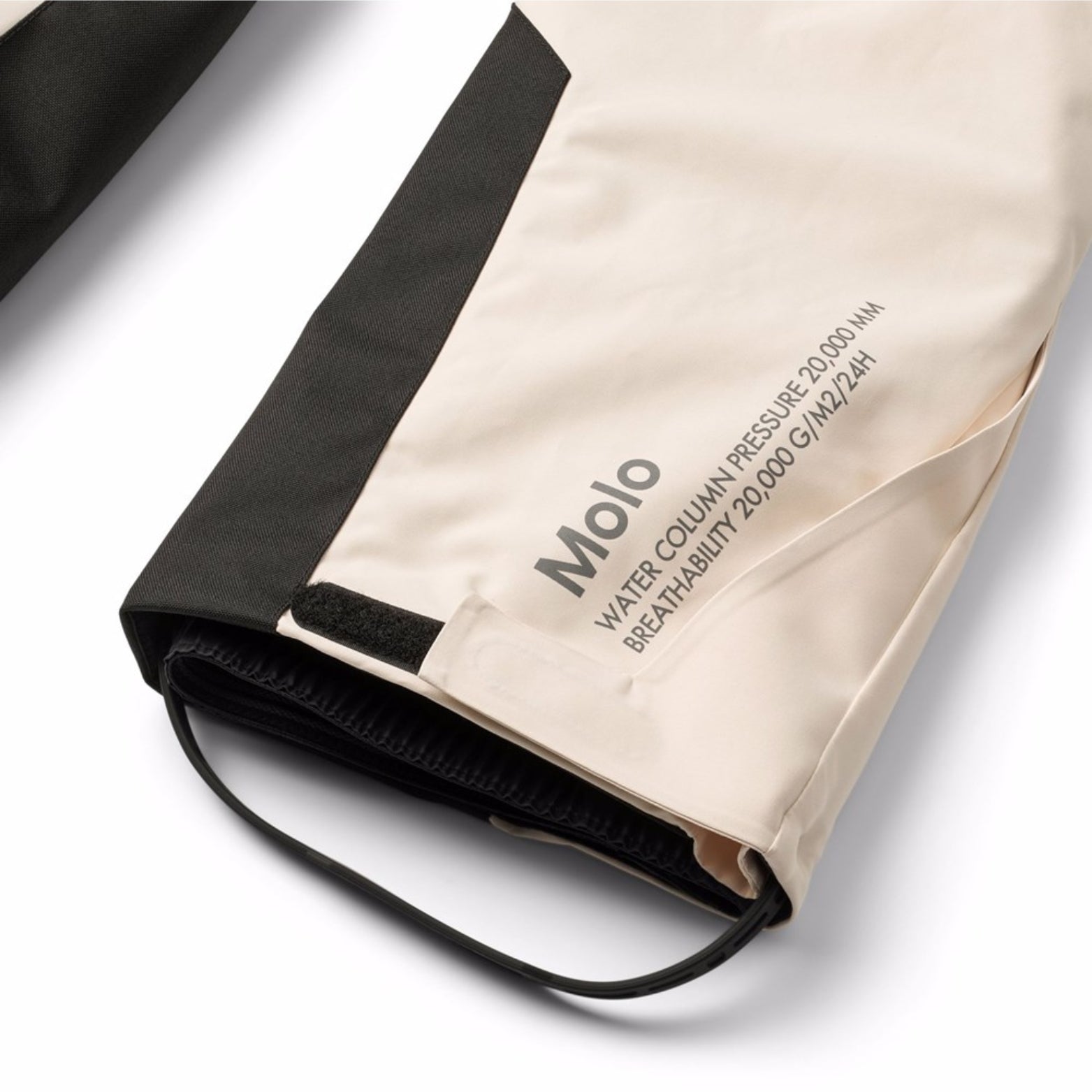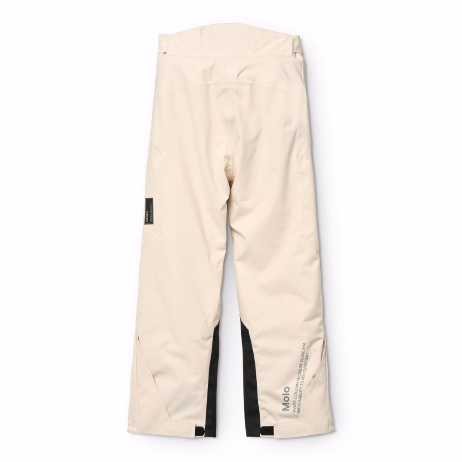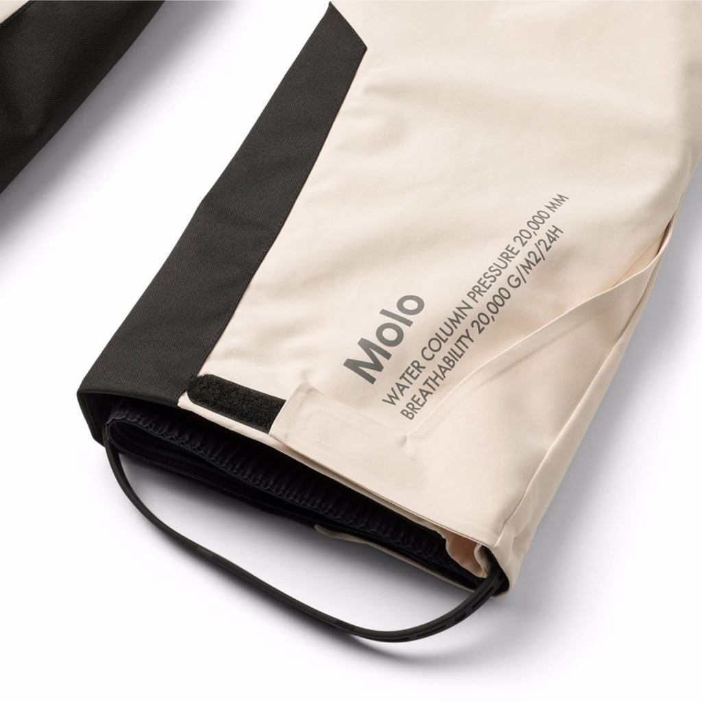 Off-white wind and waterproof ski pants made of recycled polyester. The ski pants have a snap button and zipper closure, external adjustable Velcro straps, belt loops for Molos braces (additional accessory), adjustable leg openings with snow gaiters and extra reinforcement between the legs. The ski pants have waterproof pockets and a reflective text on the back to increase the visibility in traffic. Additionally, the ski pants are lined with fleece in exposed areas and padded with 3M™ Thinsulate™.