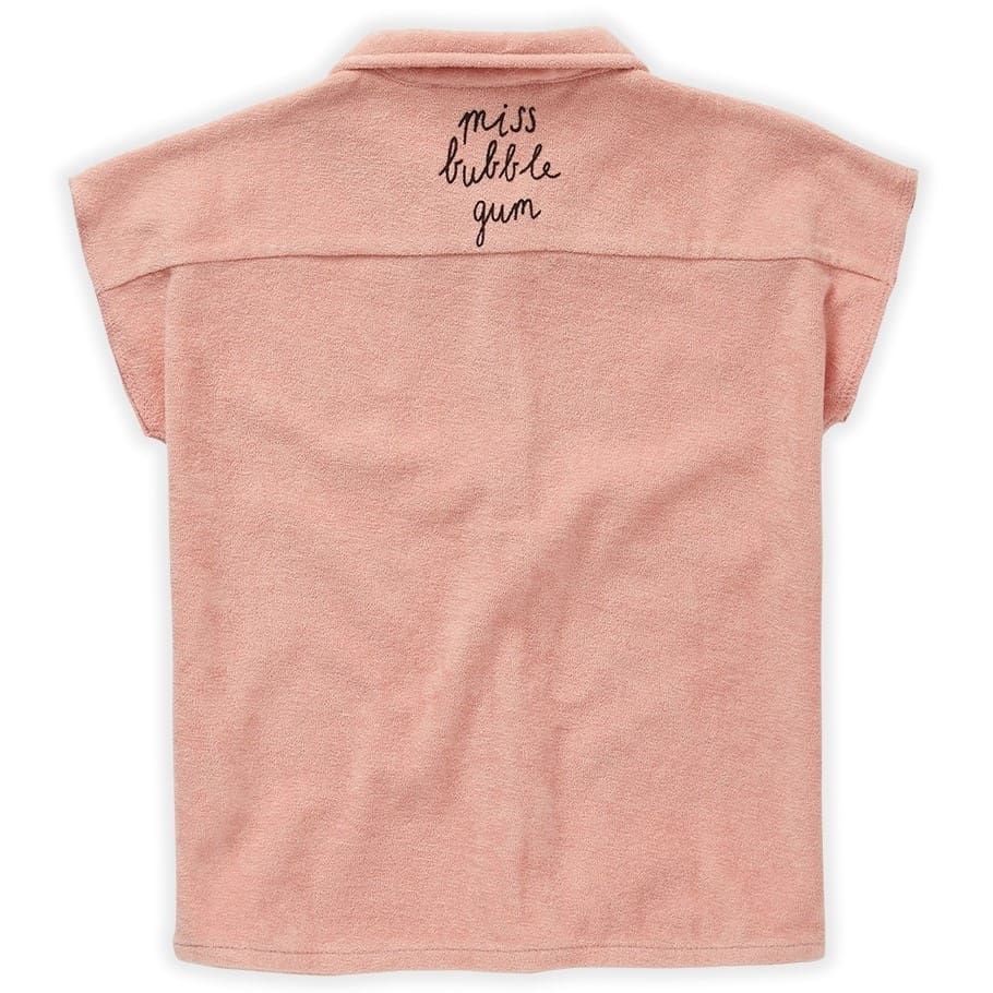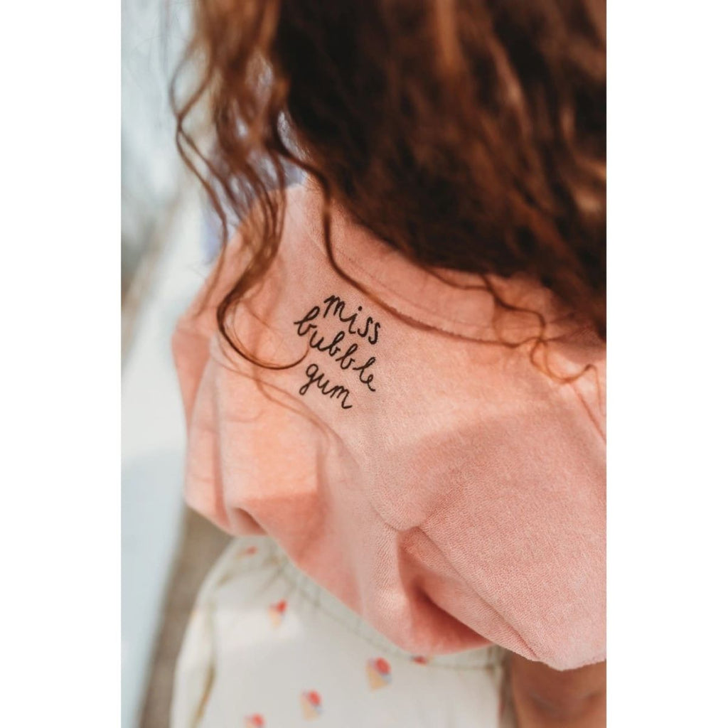 This sleeveless blossom coloured top is a versatile addition to your child’s wardrobe. It features a classic collar, button-down front, and ‘Miss Bubble Gum’ lettering on the back neckline. It is crafted from 100% organic cotton.