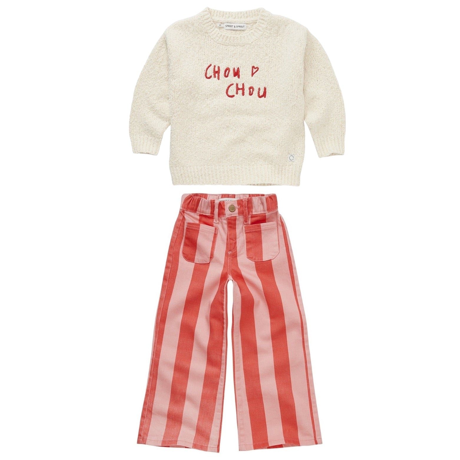 Bold stripes meet timeless denim. These grenadine-coloured flare jeans bring energy to the everyday – tough enough for play, cool enough for everything else. The pants are equipped with an adjustable tape inside the waistband, offering a customized fit as your child grows.
