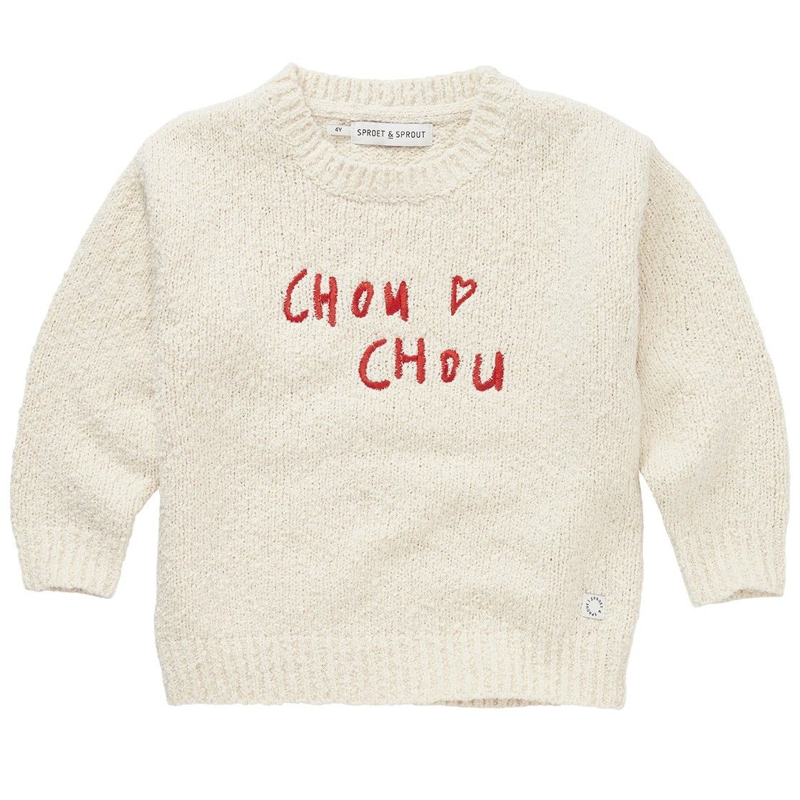 This ivory knitted sweater has a cosy bouclé look and is made from a soft cotton blend. Featuring playful ‘Chou Chou’ embroidery on the chest — super cute with a tutu, or styled with jeans for a cooler vibe.