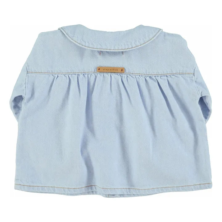 - Peter Pan collar blouse with black buttons on the front. Elasticated cuffs. Frilled yoke. Detailed with leather logo on the back.