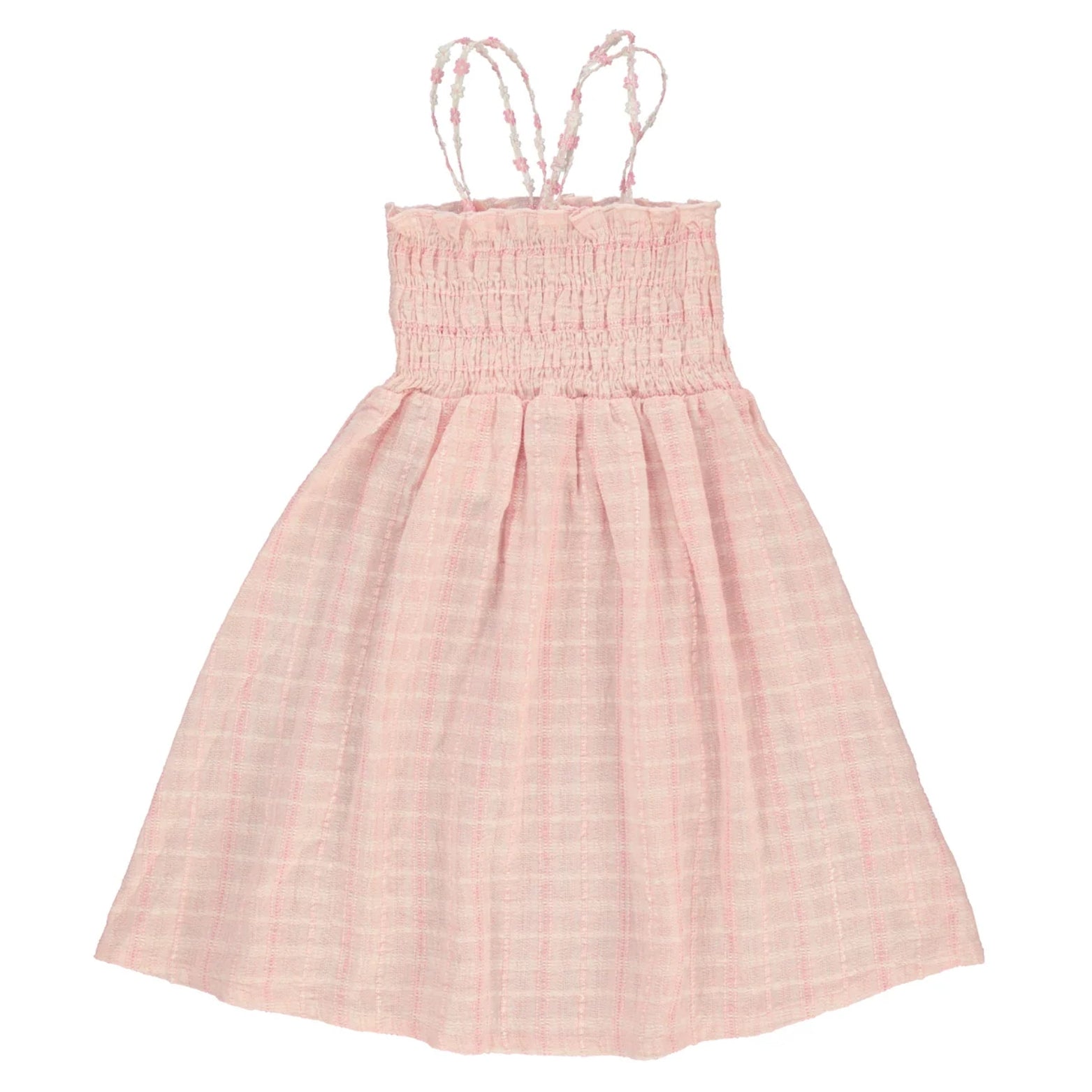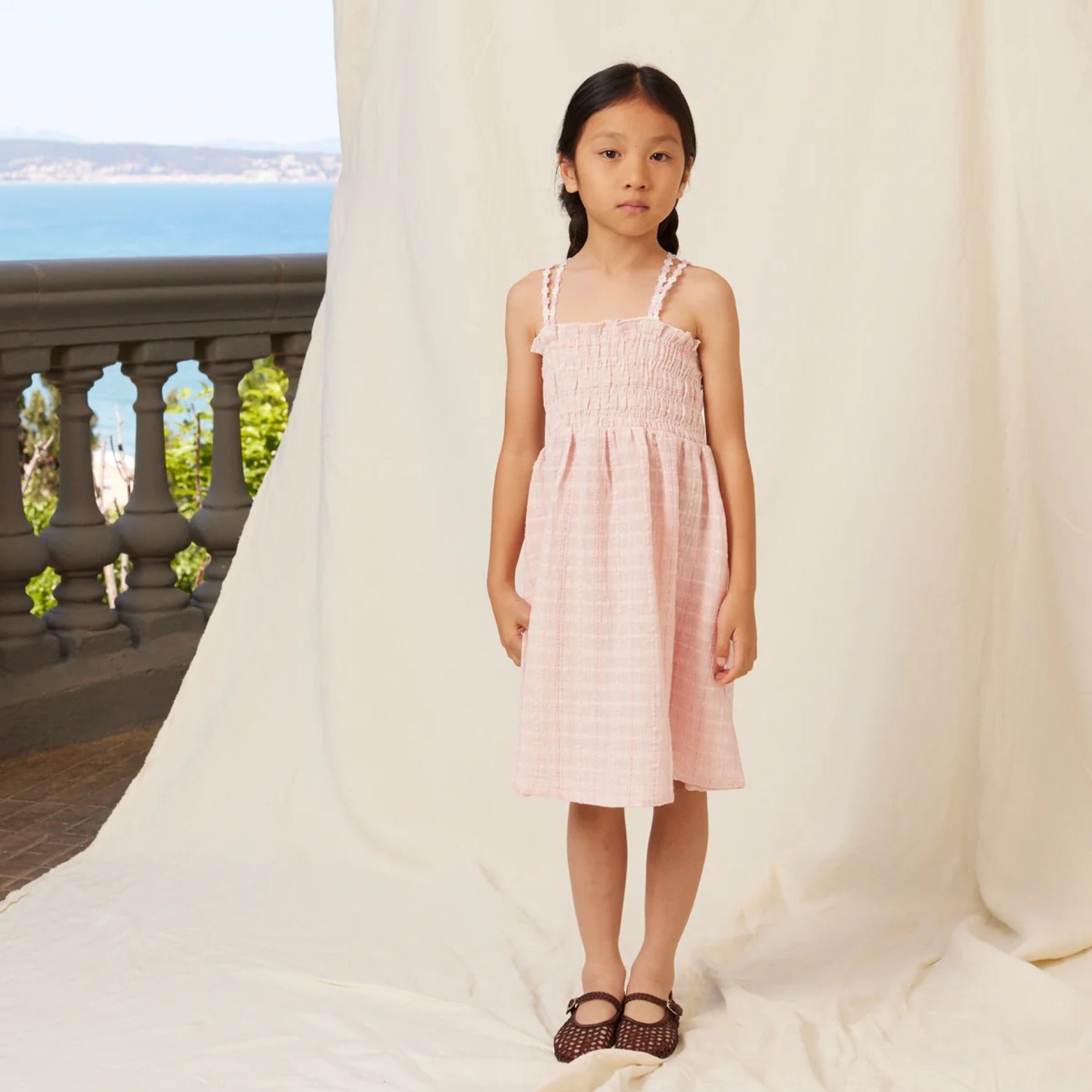 Inspired by bohemian summer seaside holidays, Emma dress is made from the softest 100% cotton in gentle pink. The dress features an elegant, smocked bodice and mesmerizing lace straps with adorable flowers – a design combining elegance and comfort. Perfect for summer celebrations ahead.