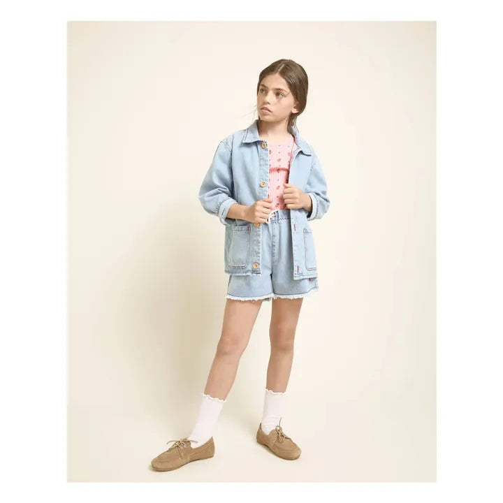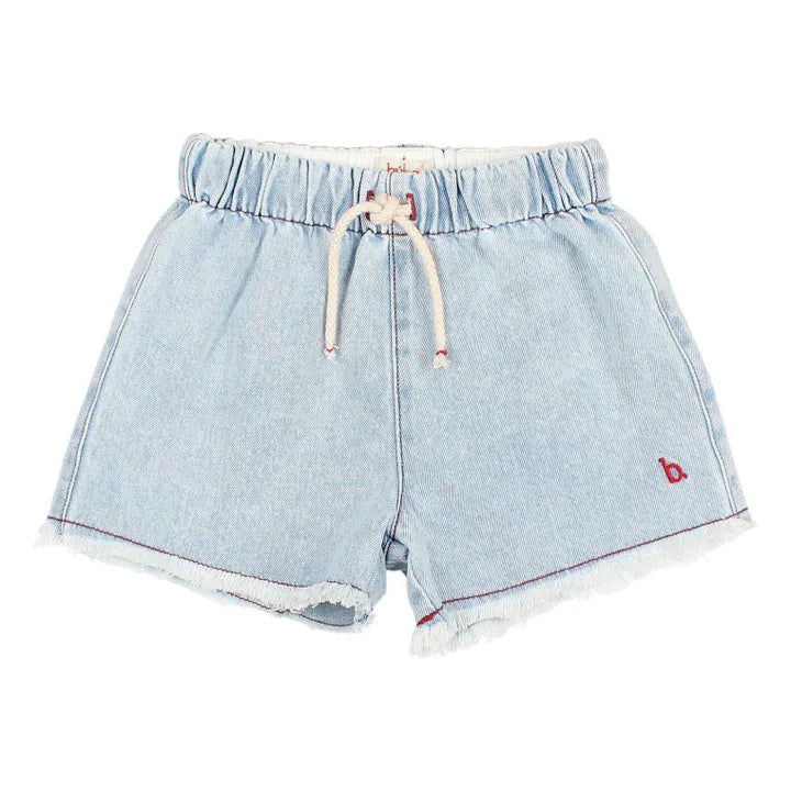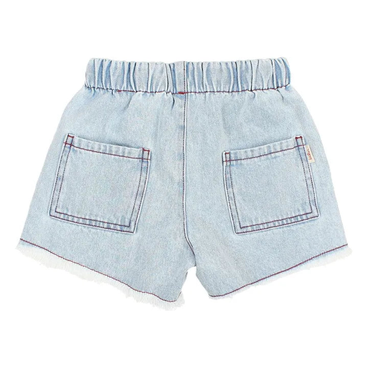 - Light wash denim shorts. Elastic waistband with raw cotton drawstring for adjustment. Plastron-style pockets on the back. Frayed hem. Contrasting decorative embroidery. Contrasting stitching and topstitching details.