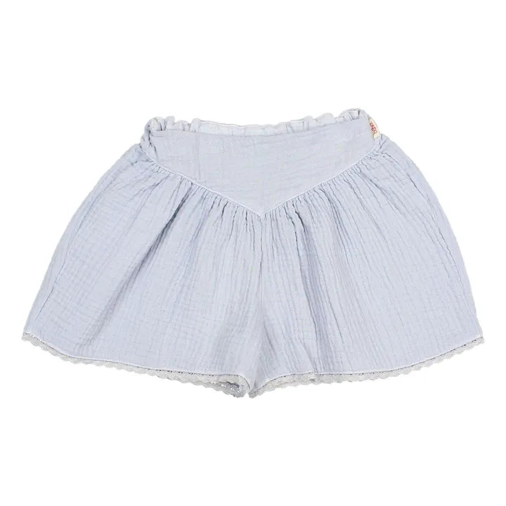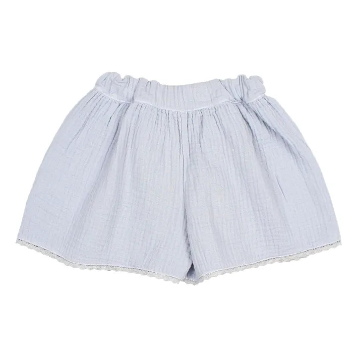 - Cotton muslin shorts. With gathers to create a skirt effect. Elastic waistband at the back and V-shape at the front. Hem with lace detail. Checkered fabric waistband lining.