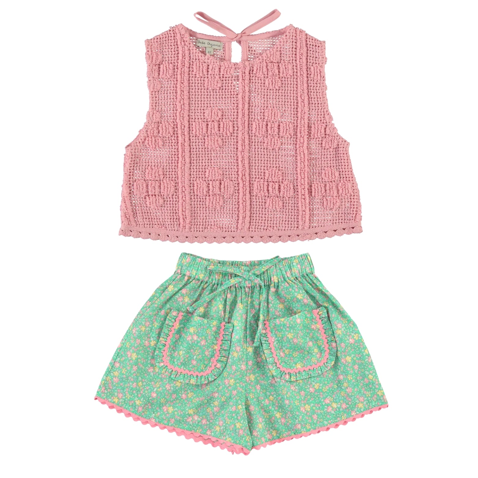A favorite for the spring/summer season, Hazel shorts in lovely green floral print with contrasting pink detailing. Crafted in softest cotton fabric with an elasticated waist and comfortable fit, featuring adorable pockets. Matches wonderfully with the Hazel top.