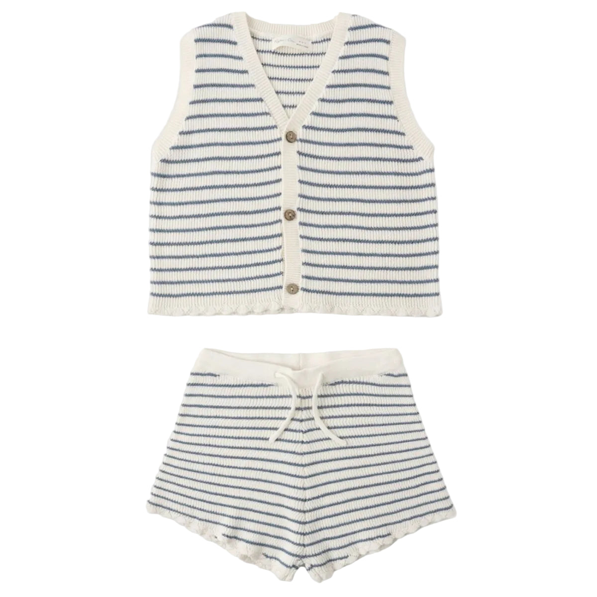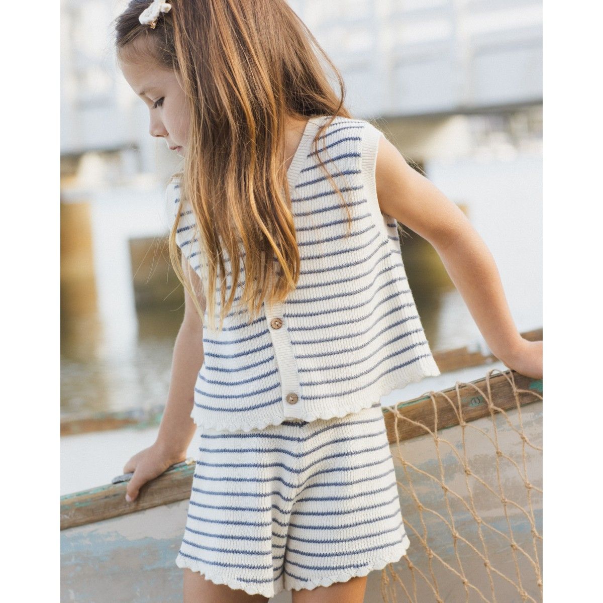 Your go-to look for summer! Featuring coconut buttons down the front and crocheted scalloped trim. Bring on the good times in this groovy set. Featuring our ‘marine stripe’ pattern. Care: Hand wash only. Made of 100% cotton.