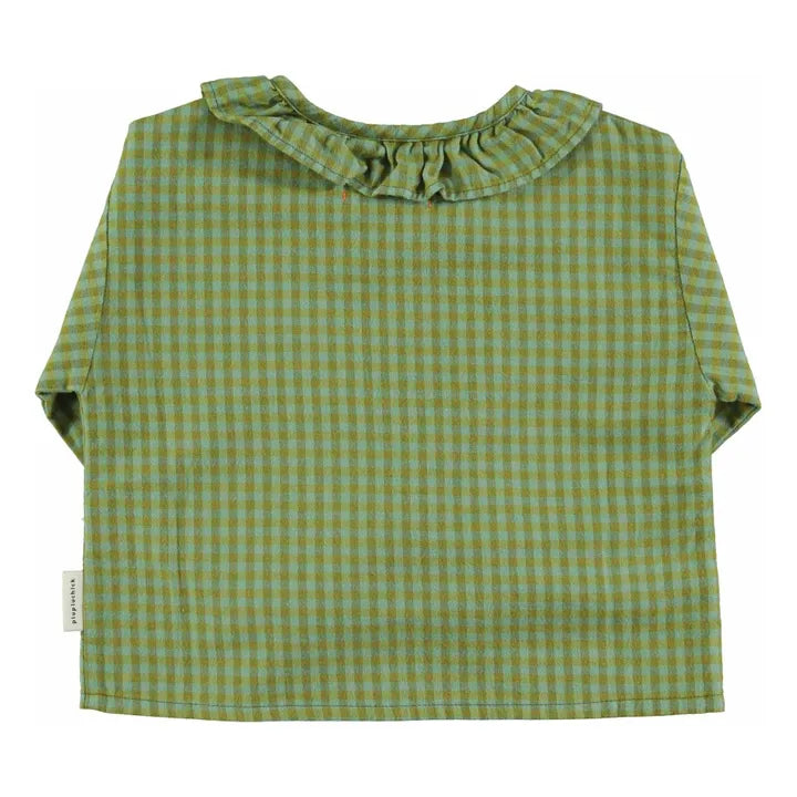 - Blouse with round and frilled collar. Buttons on the front. Elasticated cuffs.