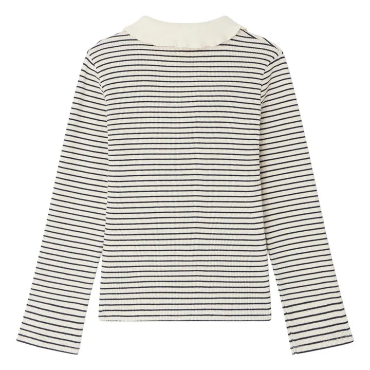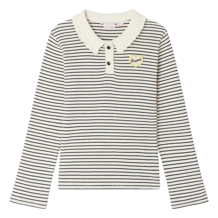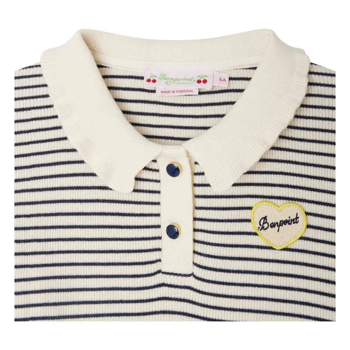 • The Juanna t-shirt for girls features horizontal stripes and a delightful Bonpoint heart badge on the chest. Its plain ruffled polo collar finished with contrasting buttons reinforces its personality.