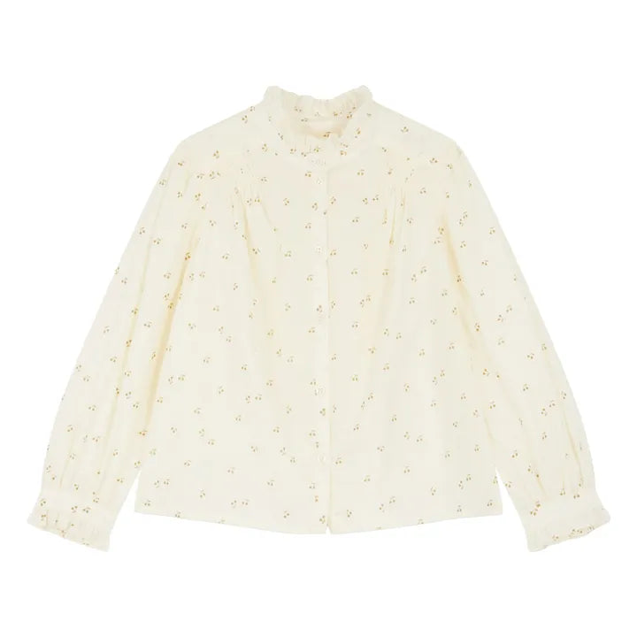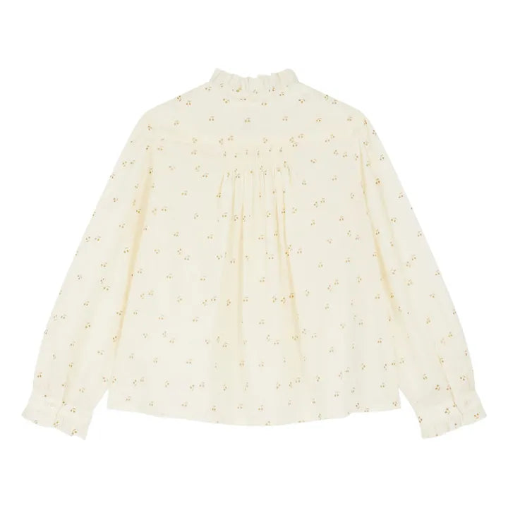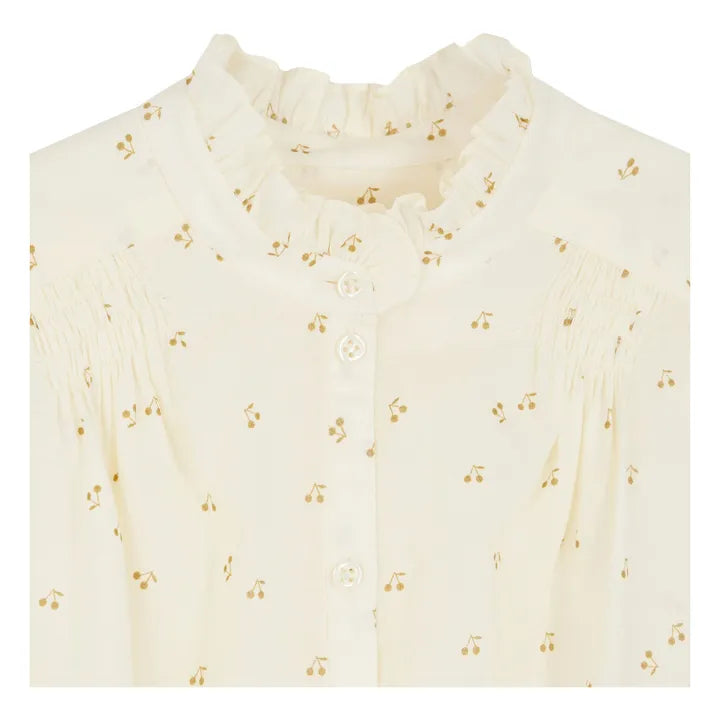 - The blouse for girls embodies the House's sophistication, with its fluid cotton voile fabric sublimated with golden cherries in metallic thread. The high collar and cuffs feature a matching ruffle. Gathers under the shoulders and at the back give movement to this slightly flared model. The front features a full opening with tone-on-tone buttons.