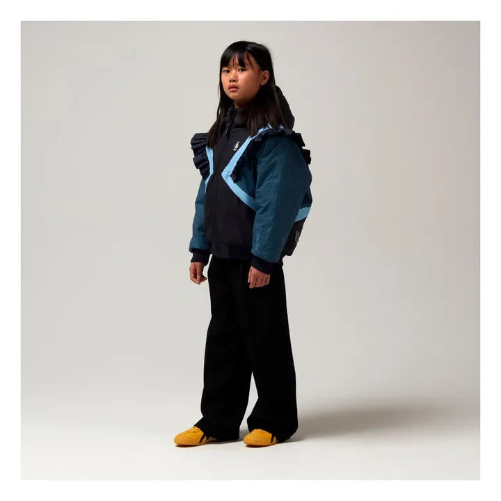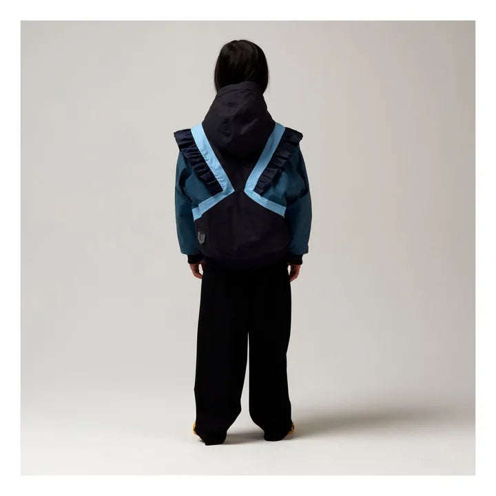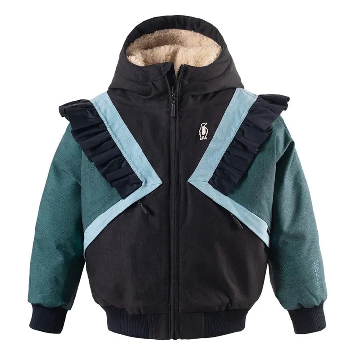 Fly high little birdie! The SMILING DOVE is the perfect style for kids that like to stand out. Deep set sleeves, colour block panels and ruffles give the jacket a playful and fun look.