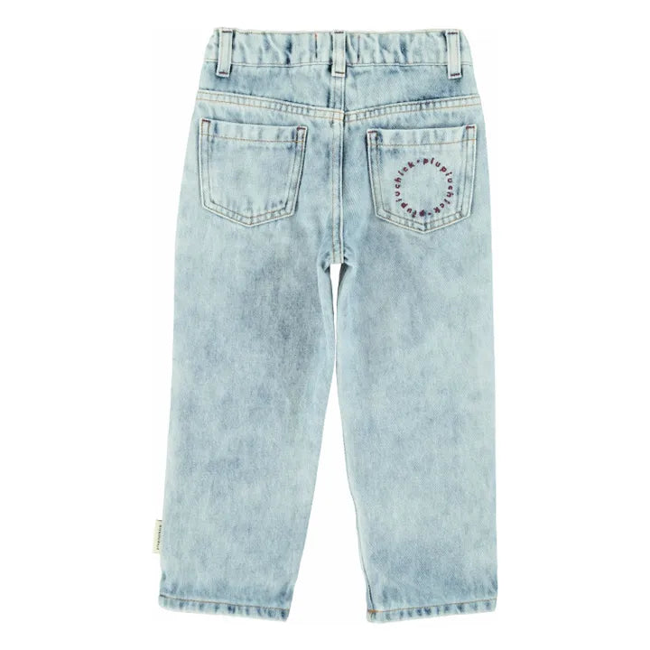 • Unisex denim trousers with adjustable waist. Detailed with bordeaux logo embroidery in one back pocket.