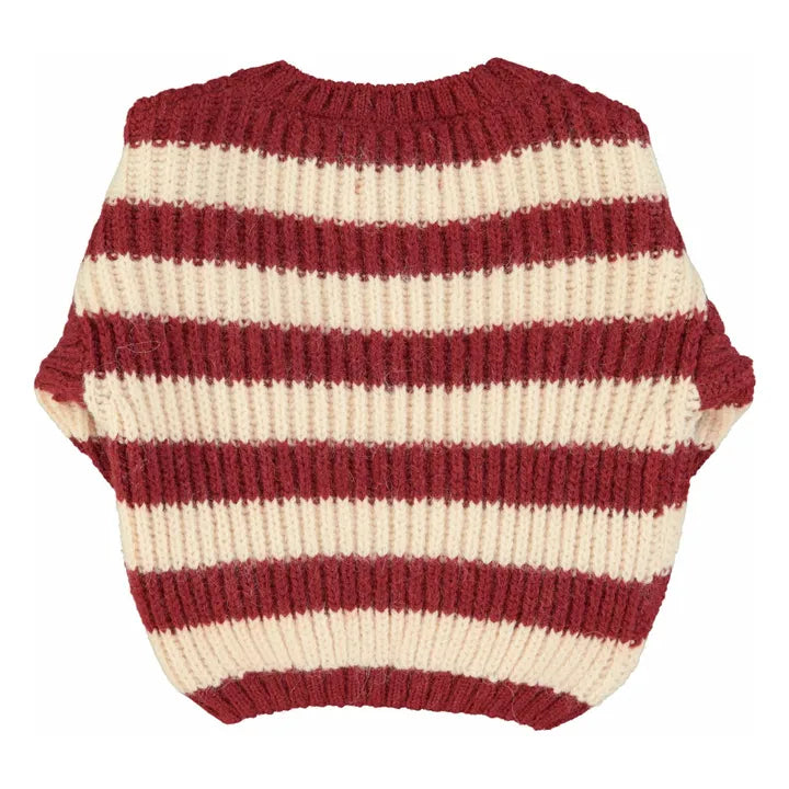 - Knitted sweater with bordeaux and light pink stripes detailed with leather logo label. Baby sizes have buttons on the shoulder.