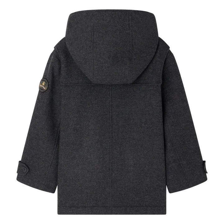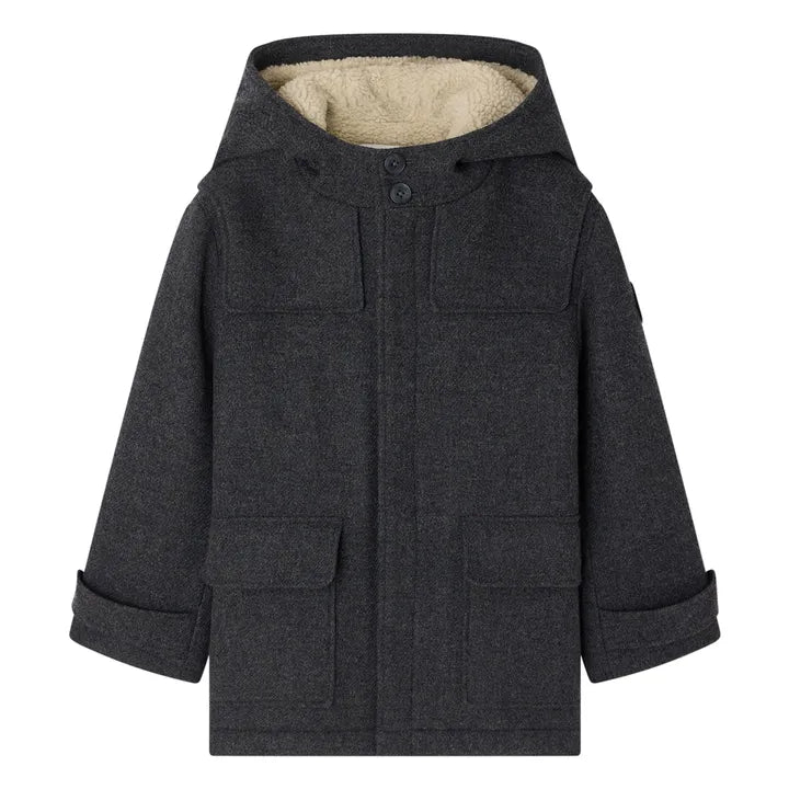 - The Julien duffle-coat for boys doubles up on sophistication with its wool sheet and sherpa lining. It fastens at the front with a zip and buttons at the collar.