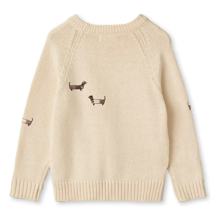• Classic pullover in organic cotton with long raglan sleeves. The pullover has a loose fit and rib knit at sleeves, neck, and hem. It is decorated with small embroidered dachshunds with a vest on. Perhaps your kid can count them all?