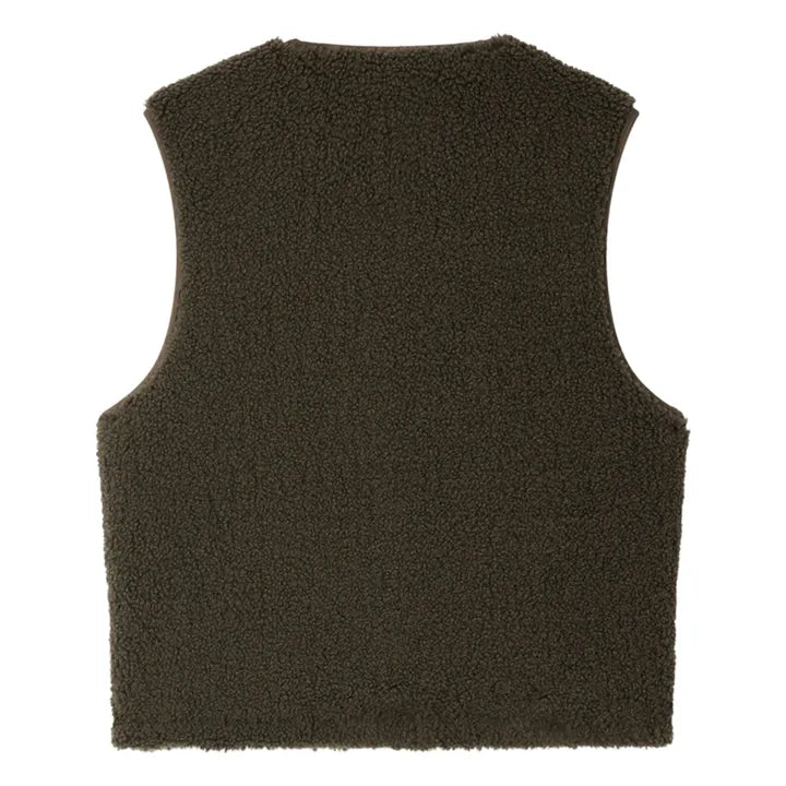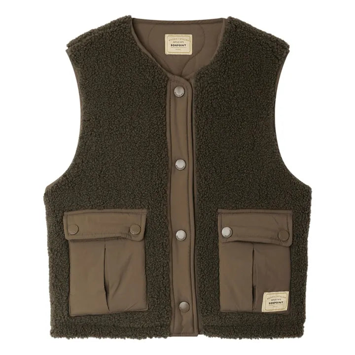 - The Junior jacket keeps boys warm with its trendy sherpa fabric. Two nylon front pockets create contrast with their snap flaps and gusseted shape. The press studs are engraved with the Maison name. This reversible model features another side in nylon with workwear-style seams.In recycled polyesterFilled with down and feathers certified to guarantee animal welfareReversibleSleevelessRound neckSnap frontFinish with Bonpoint tags