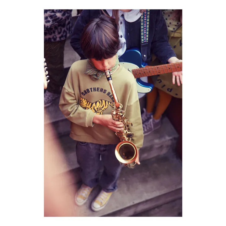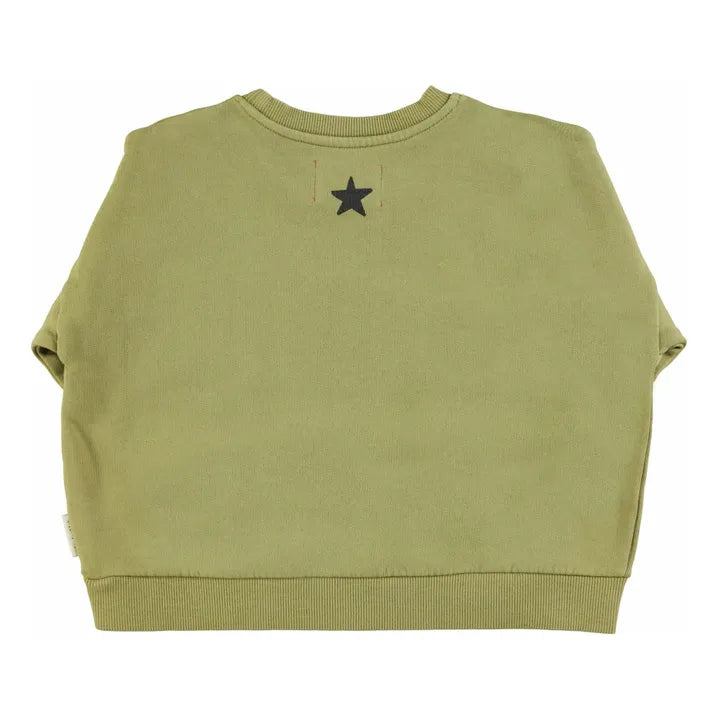 - Unisex sweatshirt with frontal print and a little black star at back. Carded organic cotton fleece. Ribbed cufs. Baby sizes have buttons on the shoulders.