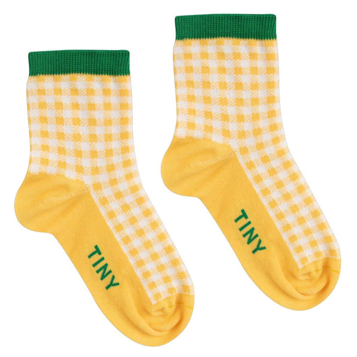 Check-mate! Yellow and off-white check quarter baby socks with grass green contrast elastic.