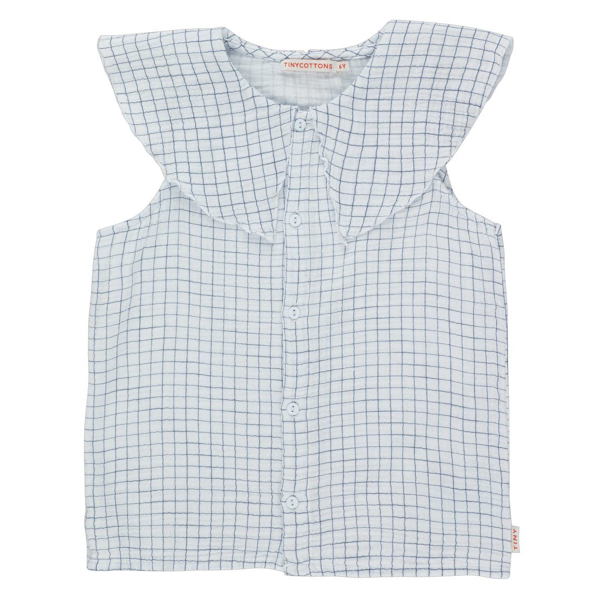 Summer pastel tones matching with the mediterranean sky. Ultramarine print on pale blue base blouse. Sleeveless, relaxed fit, round bib collar with frill and front opening with buttons.The composition is 100% cotton.