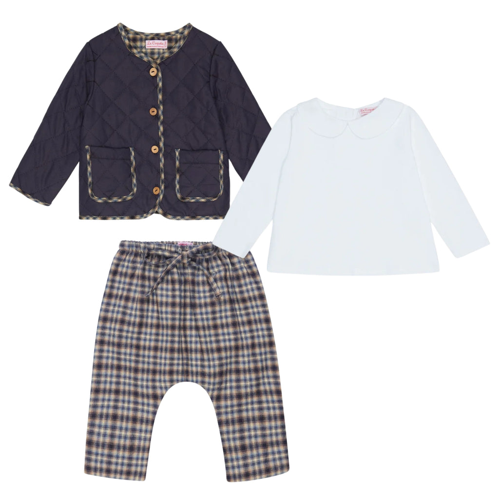 Unisex Set of 3 | Baby White Romo Long Sleeve Top & Navy Check Jacket & Navy Check Trousers