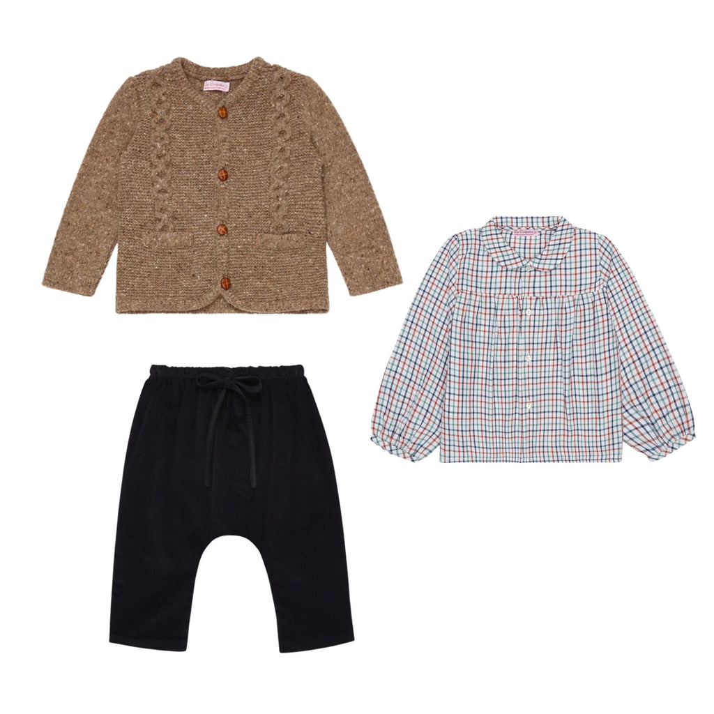 Set of 3 | Baby Colorful Check Long Sleeve Shirt & Taupe Merino Cardigan & Navy Corduroy Trousers