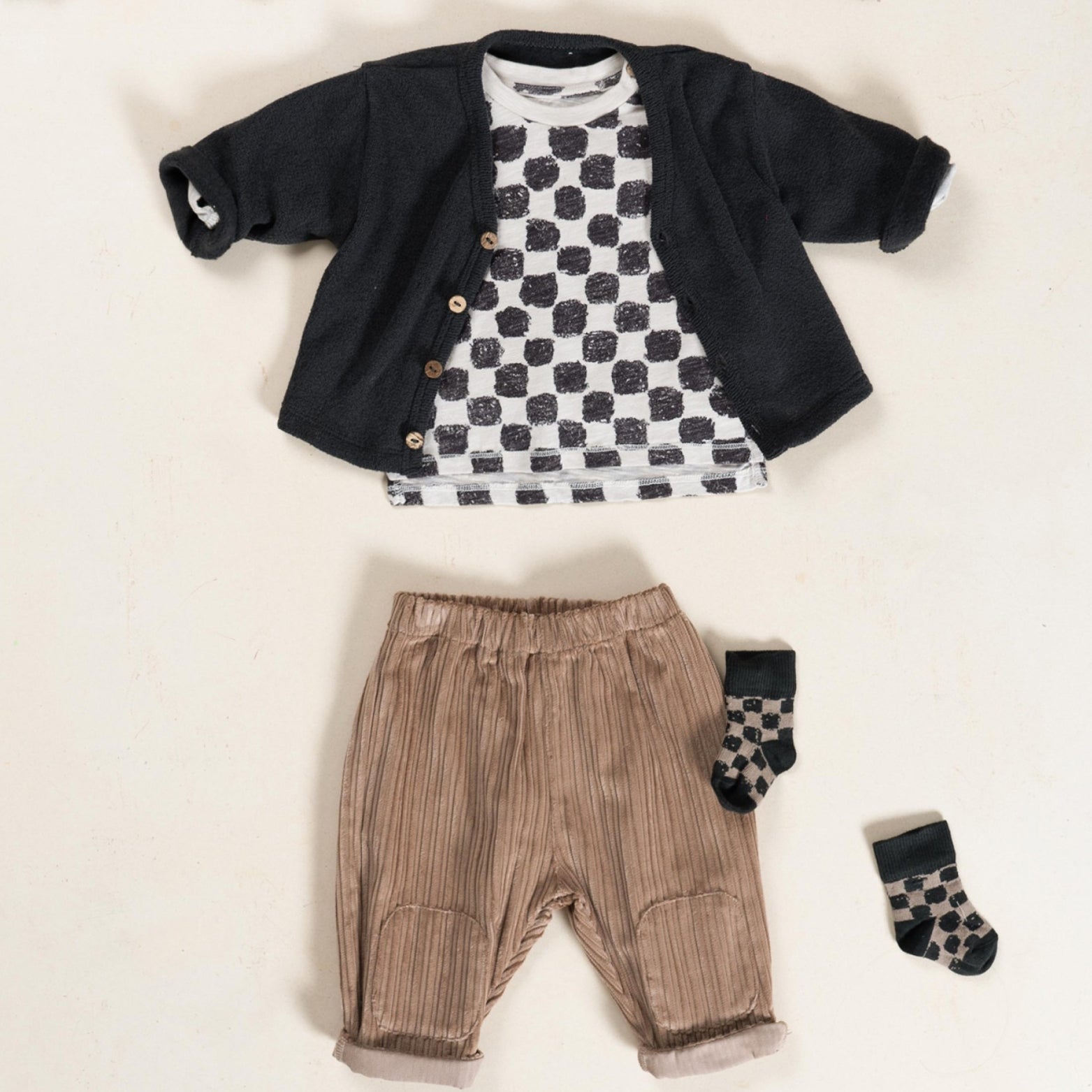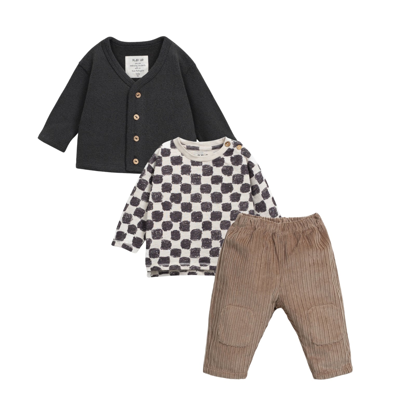Set of 3 | Brushed Fiber Charcoal Cardigan & Tiles Organic L/Sleeves Top & Light brown Corduroy Pants
