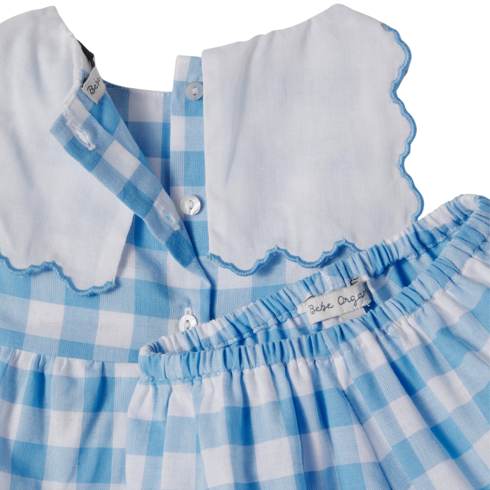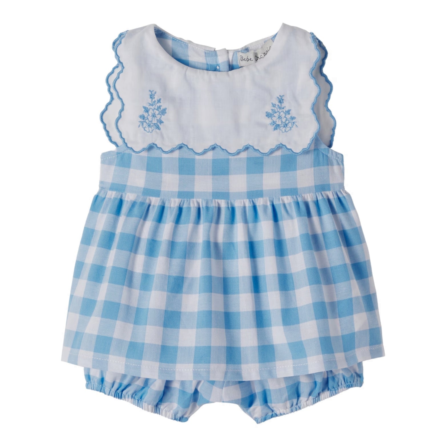 Bebe Organic promises mood-boosting styles for special moments. Crafted from pure, checked cotton, the Viola dress and bloomers set is detailed with floral embroidery at the charming collar.