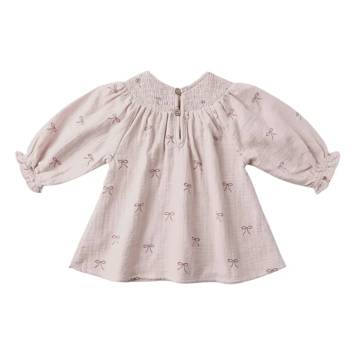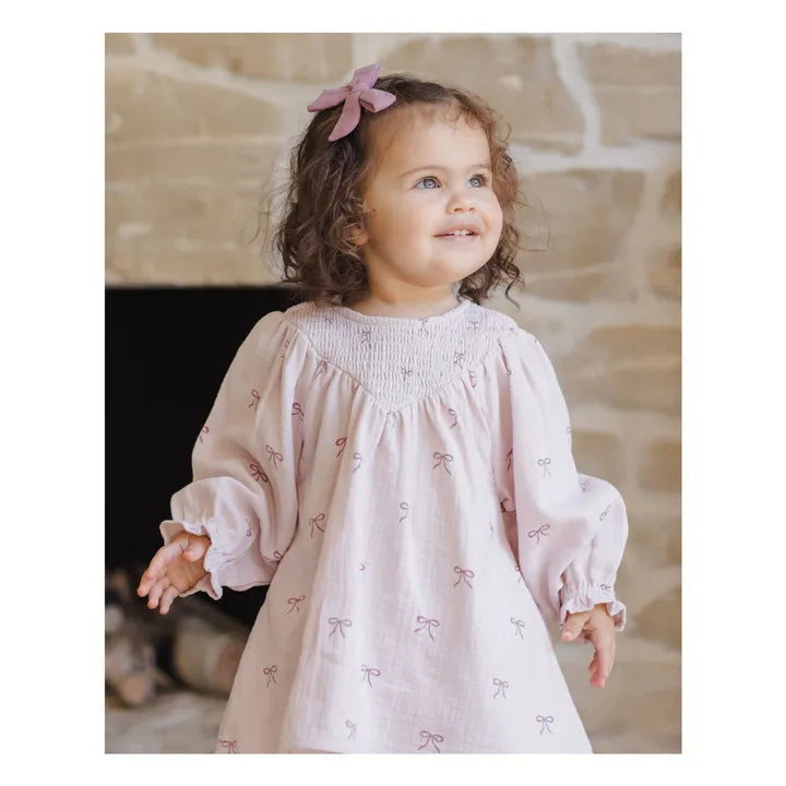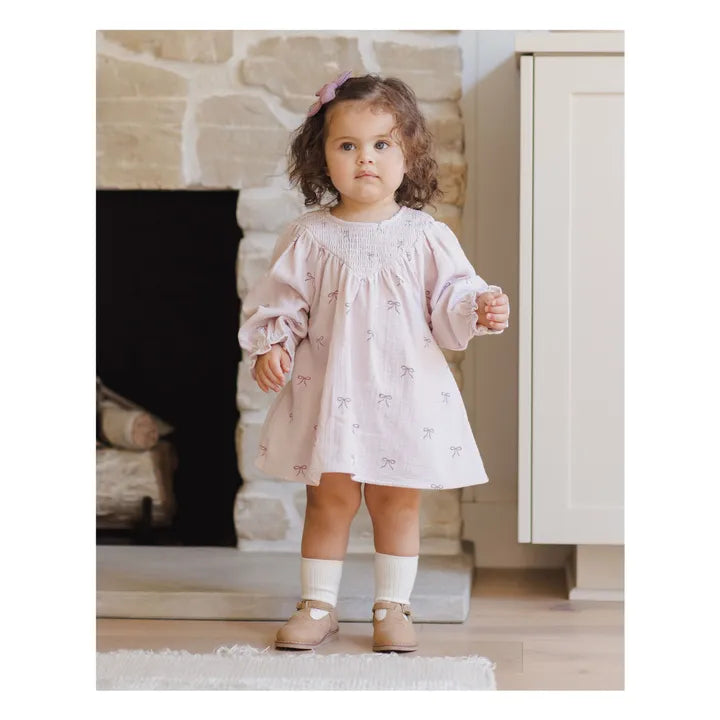 • This sweet long sleeve dress features a v-shaped smocked neckline, ruffle sleeves, and a button back closure for easy changes. Coordinating bloomers included with all sizes.